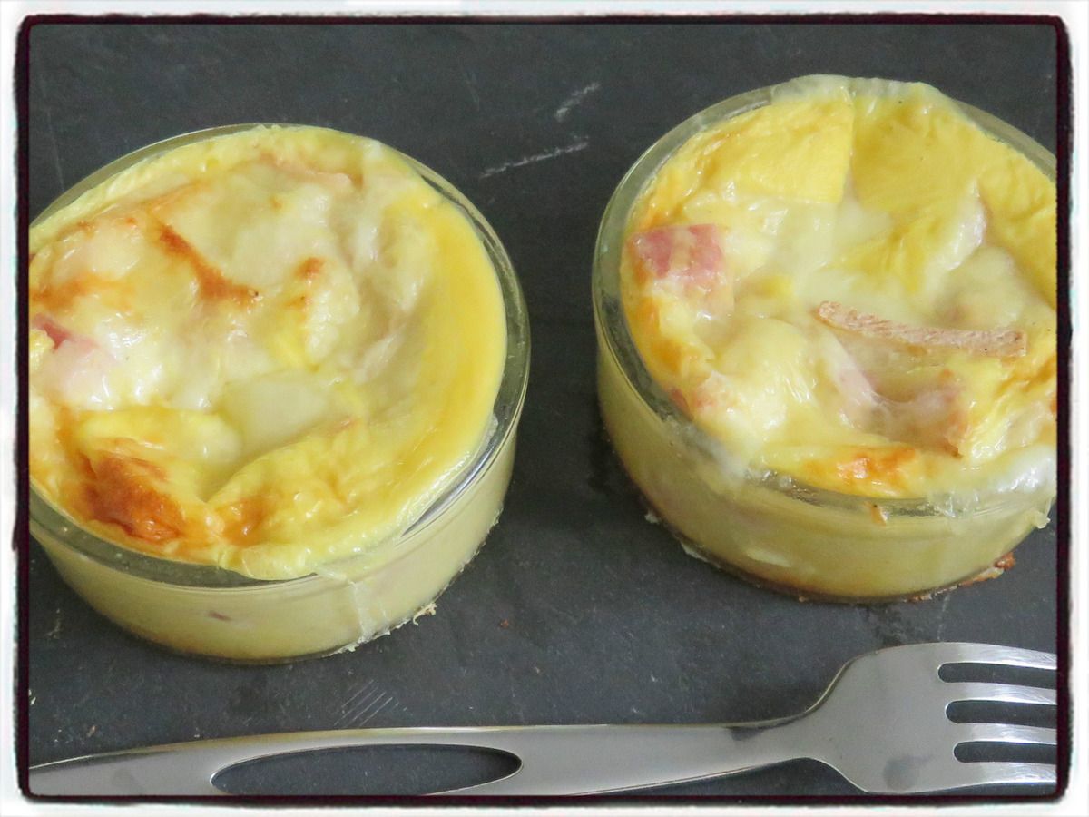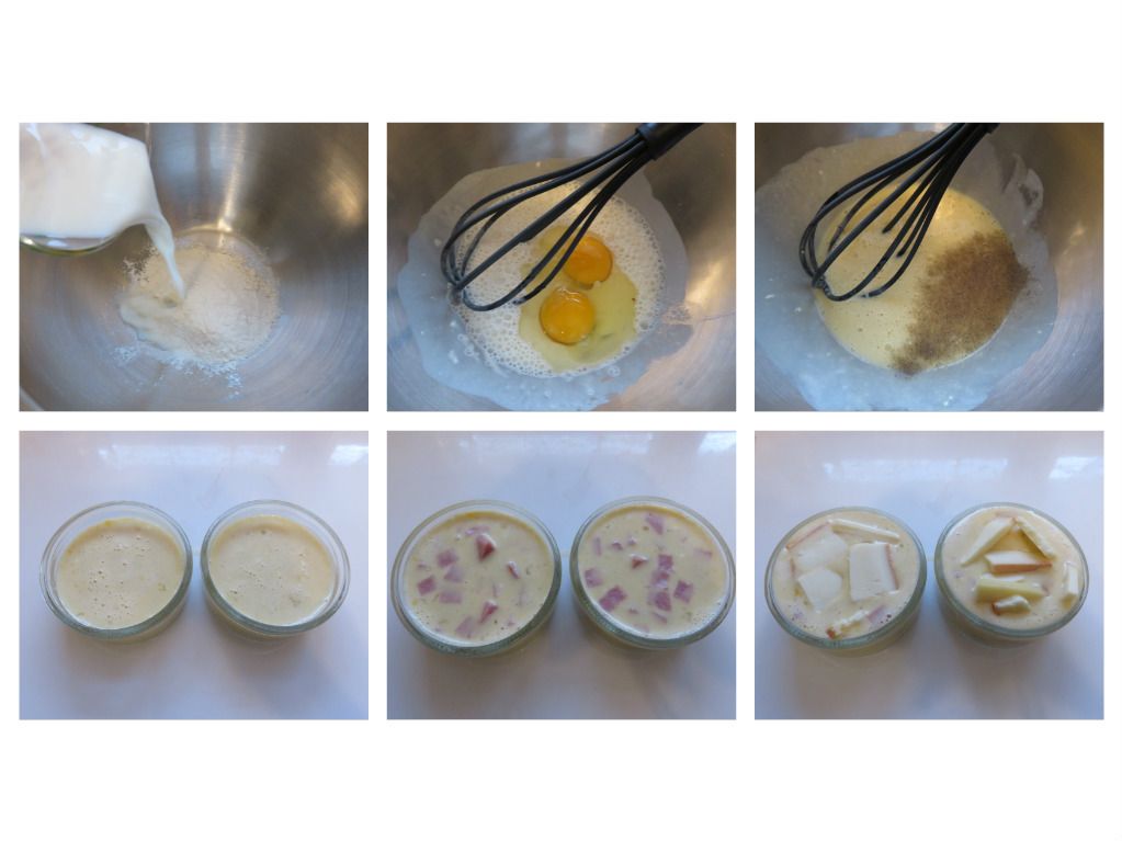 2/ Répartir la pâte dans deux petits ramequins individuels. Ajouter les dés de jambon sur la pâte, puis le fromage à raclette coupé en morceaux.