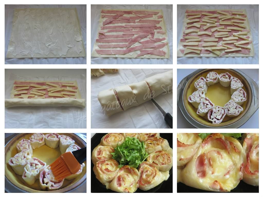 4/ Découper le boudin en 9 rondelles. Placer les rondelles en forme de couronne dans un moule et badigeonner de jaune d'oeuf.