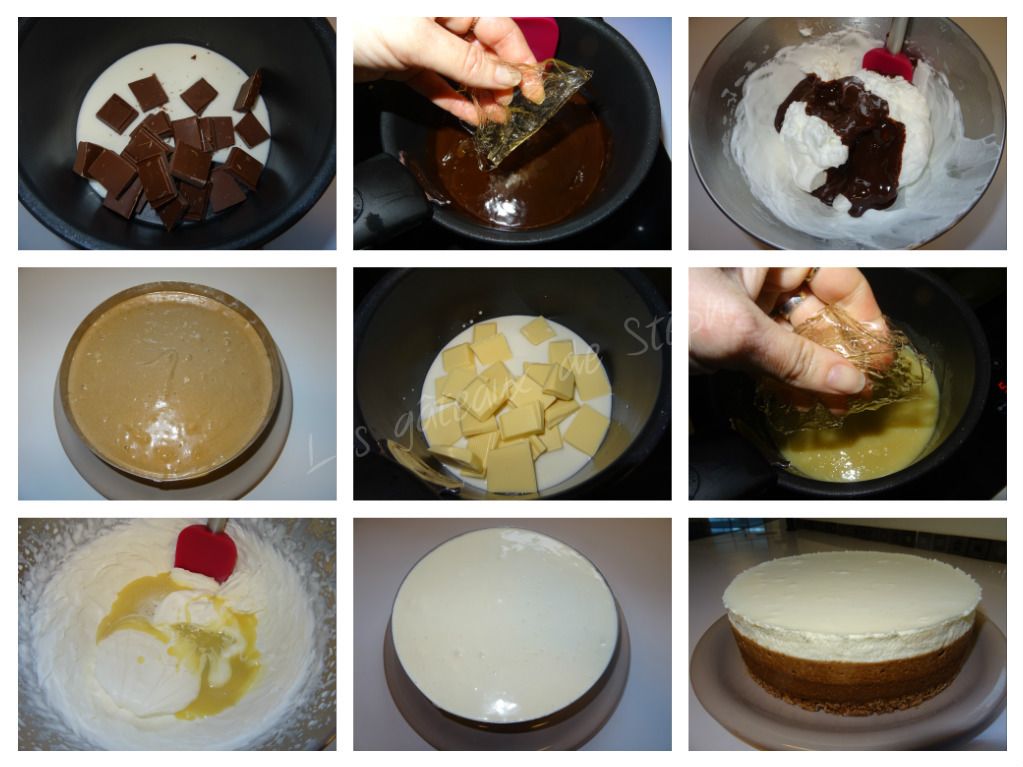 9/ Monter la crème fluide entière en chantilly et y ajouter le chocolat fondu.Verser la mousse au chocolat blanc sur la mousse au chocolat au lait et réserver 4 heures au frigo.