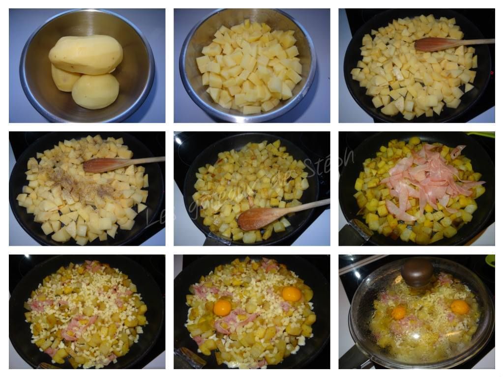 2/ Faire chauffer l'huile d'olive à la poêle et y ajouter les pommes de terre. Saler, poivrer et mettre un peu d'ail en poudre.