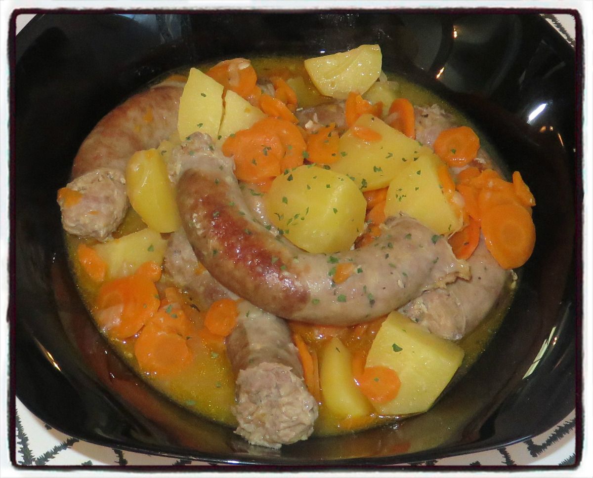 1/ Faire dorer la saucisse dans une marmite. Réserver. Dans le même récipient, faire revenir l'oignon coupé en rondelles et l'ail haché. Remettre la saucisse dans la marmite avec les oignons.