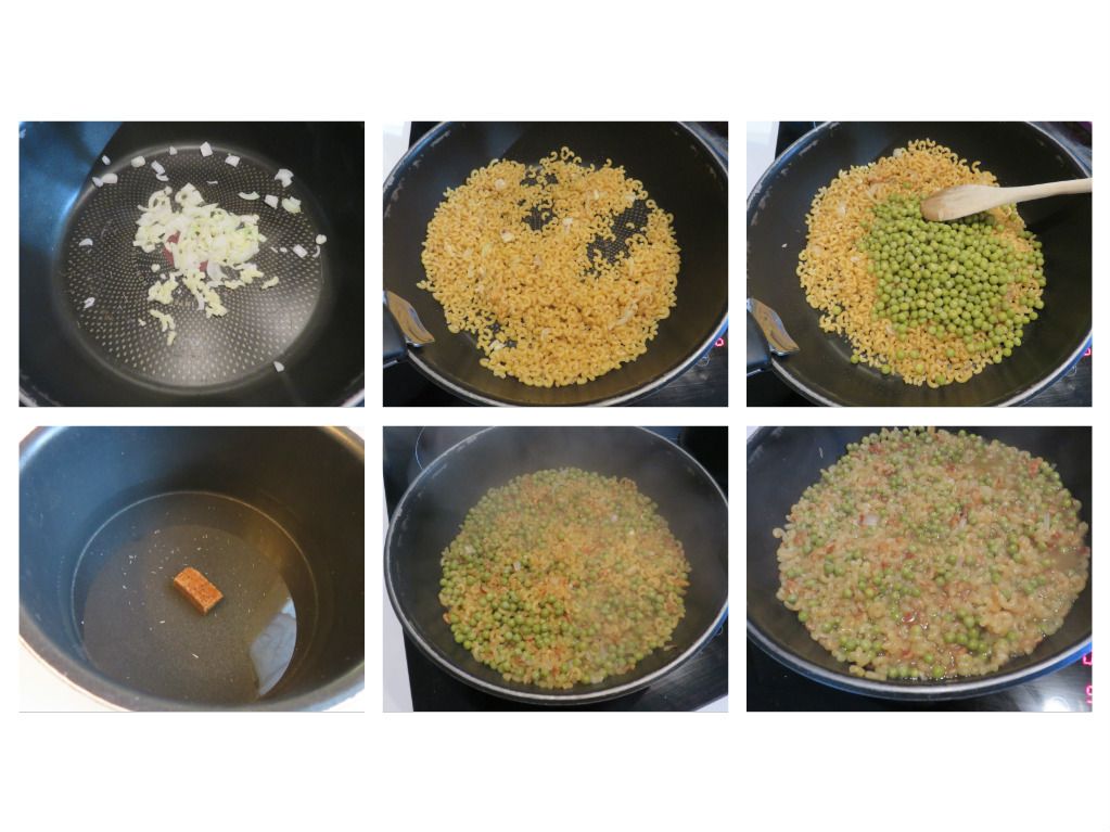 1/ Faire dorer l'oignon coupé en petits morceaux avec l'ail quelques minutes à la poêle. Y ajouter les coquillettes crues et les petits pois rincés et égouttés. Laisser rissoler quelques minutes.