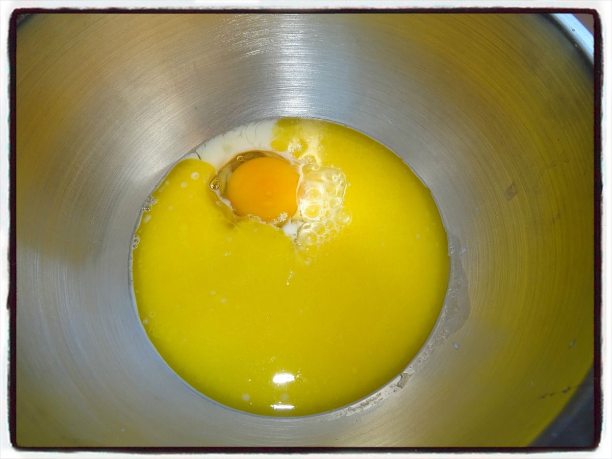 2/ Dans un autre bol, battre l’œuf entier avec le lait et le beurre fondu.
