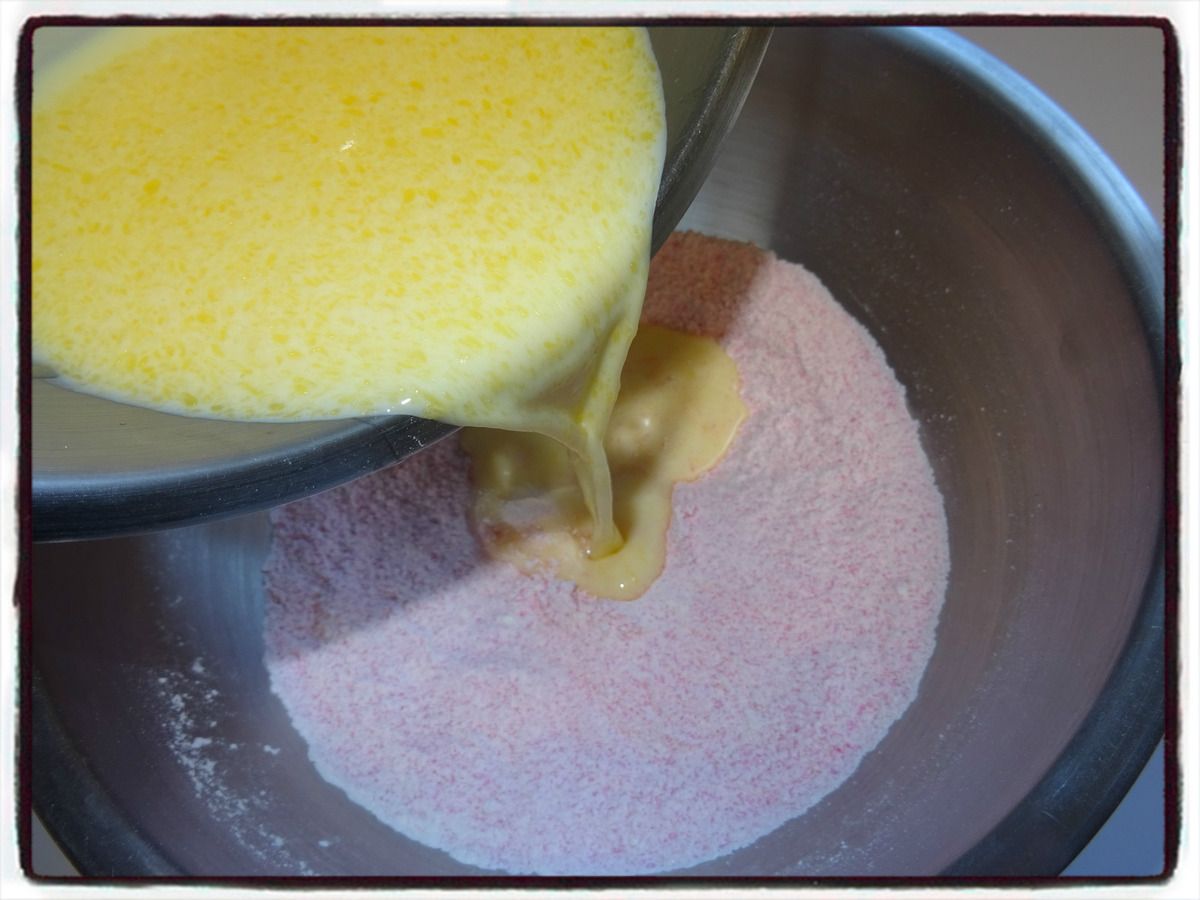 3/ Verser la préparation œuf/lait/beurre sur la préparation farine/sucre barbe à papa. Bien mélanger.