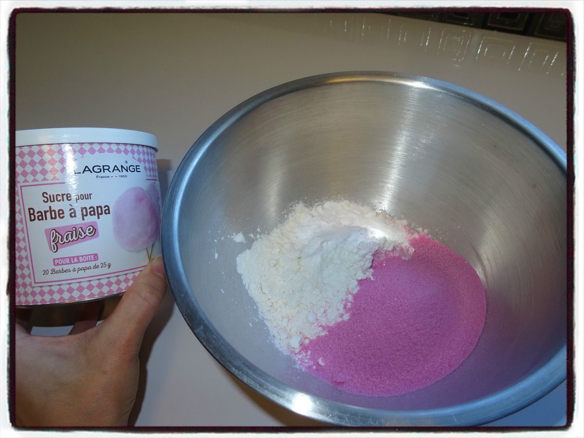 1/ Mélanger ensemble la farine, la levure et le sucre pour barbe à papa (pour info j'ai trouvé le sucre à barbe à papa en grande surface, au rayon de machine à barbe à papa).