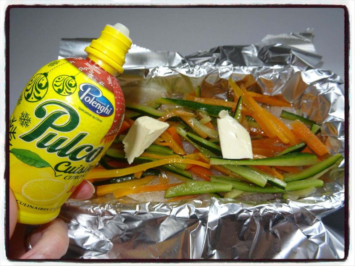 4/ Répartissez les légumes sur le poisson, mettez deux noisettes de beurre et arrosez avec un filet de jus de citron. Repliez le papier aluminium sur la garniture.