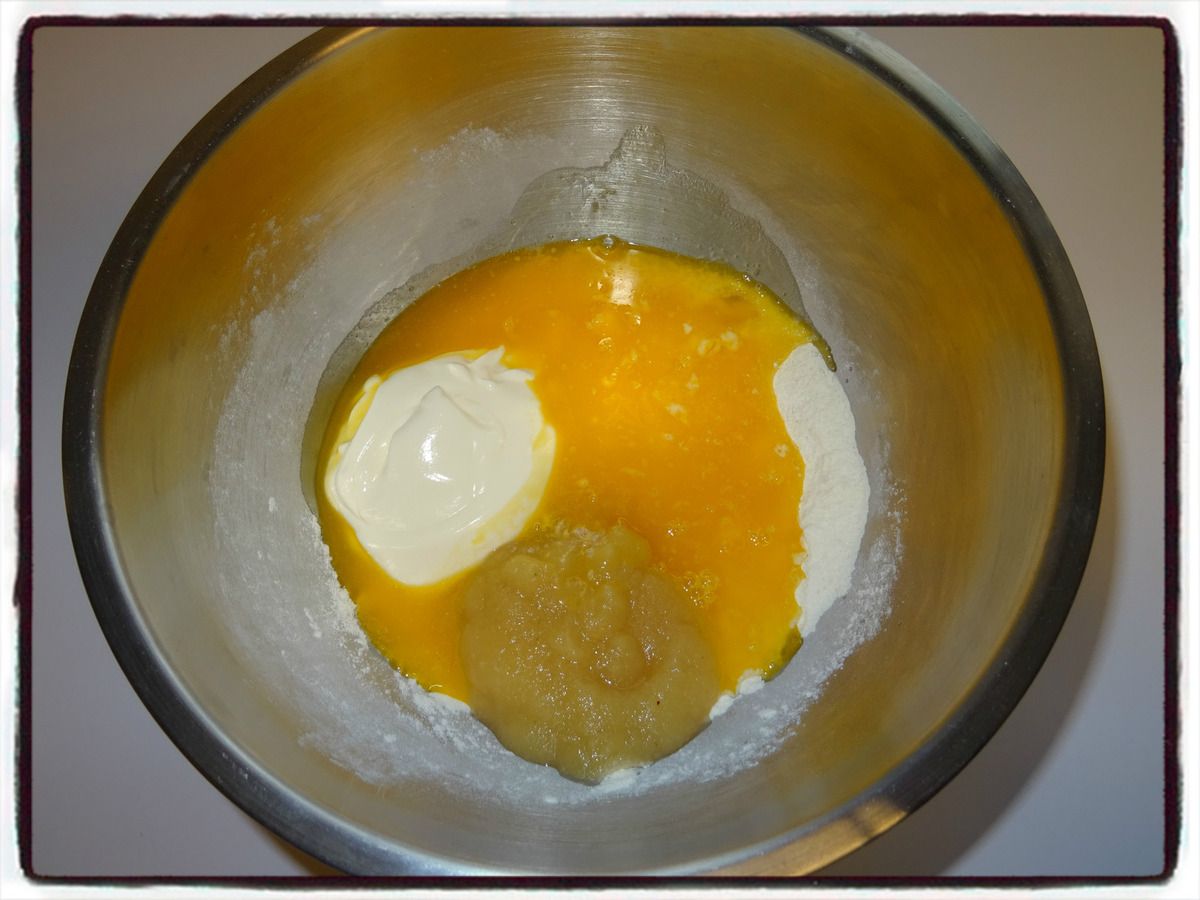 2/ Ajoutez la compote, la crème fraîche et le beurre fondu. Mélangez bien.