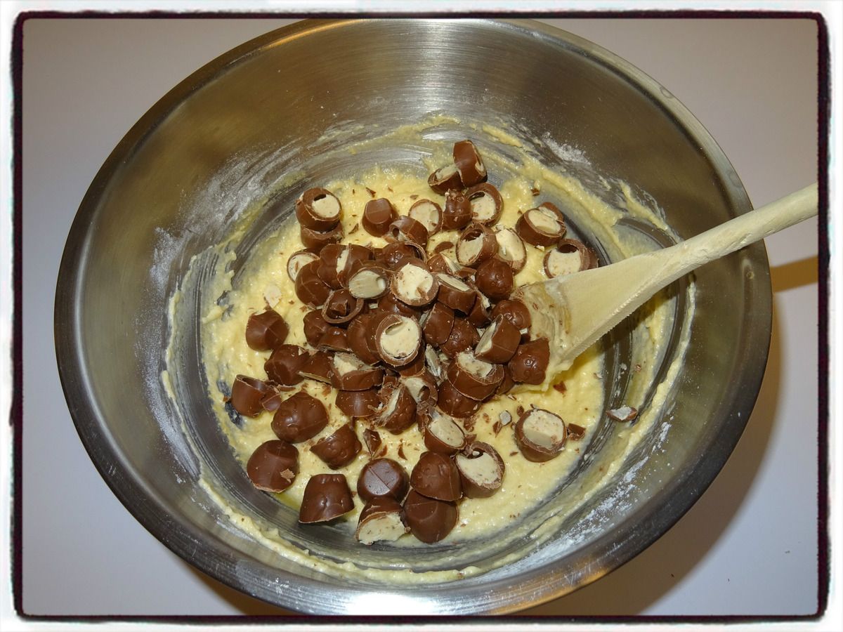 3/ Coupez les schokobons en petits morceaux et incorporez-les à la préparation précédente.