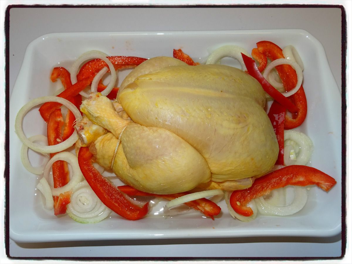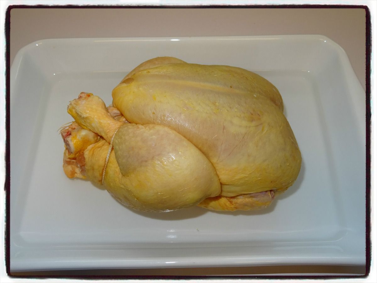 1/ Mettez le poulet dans un plat et versez l'eau tout autour.