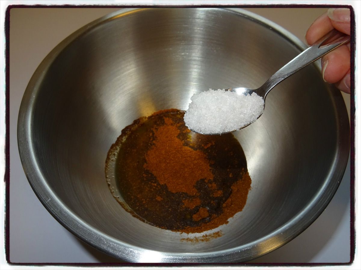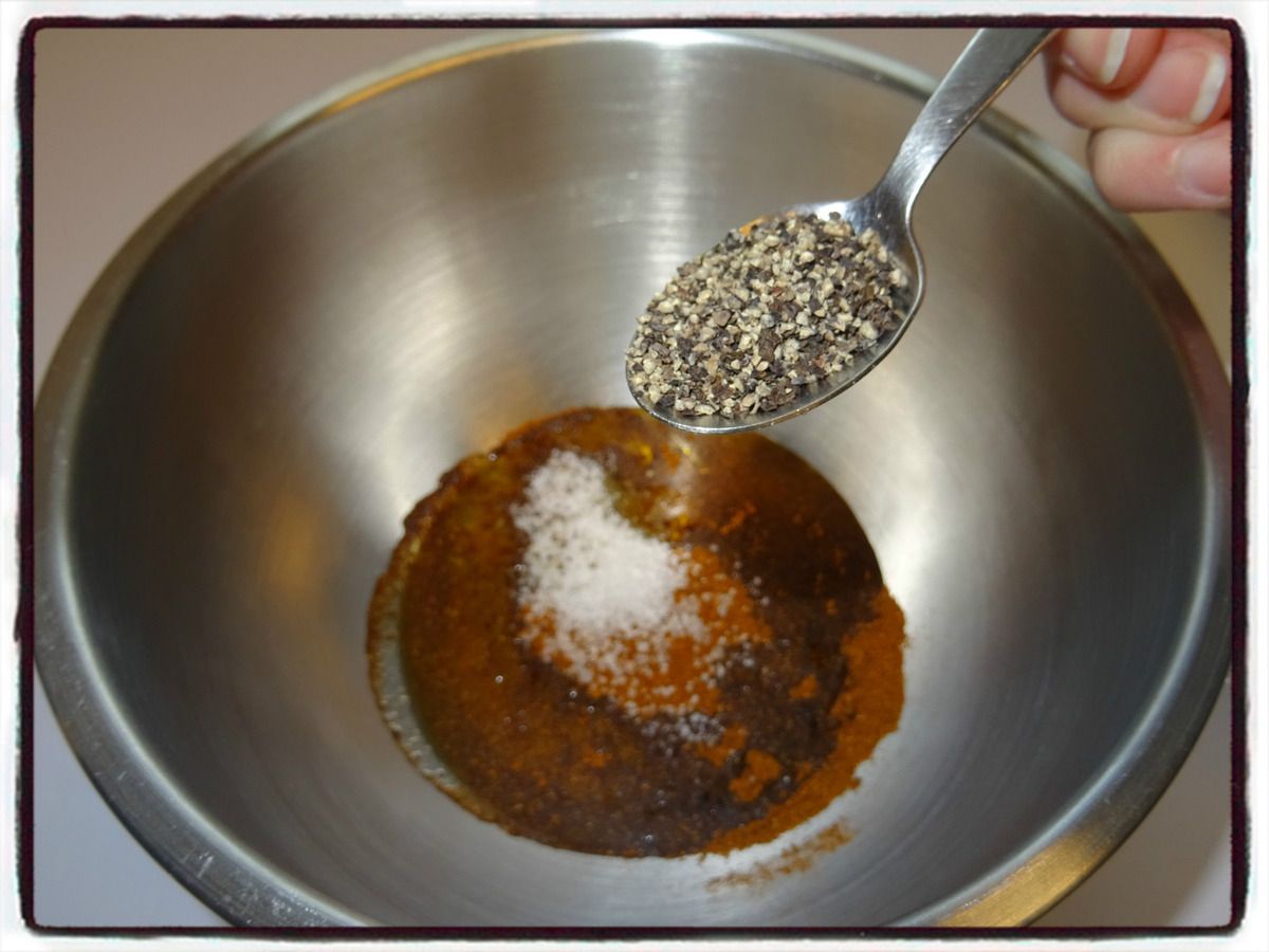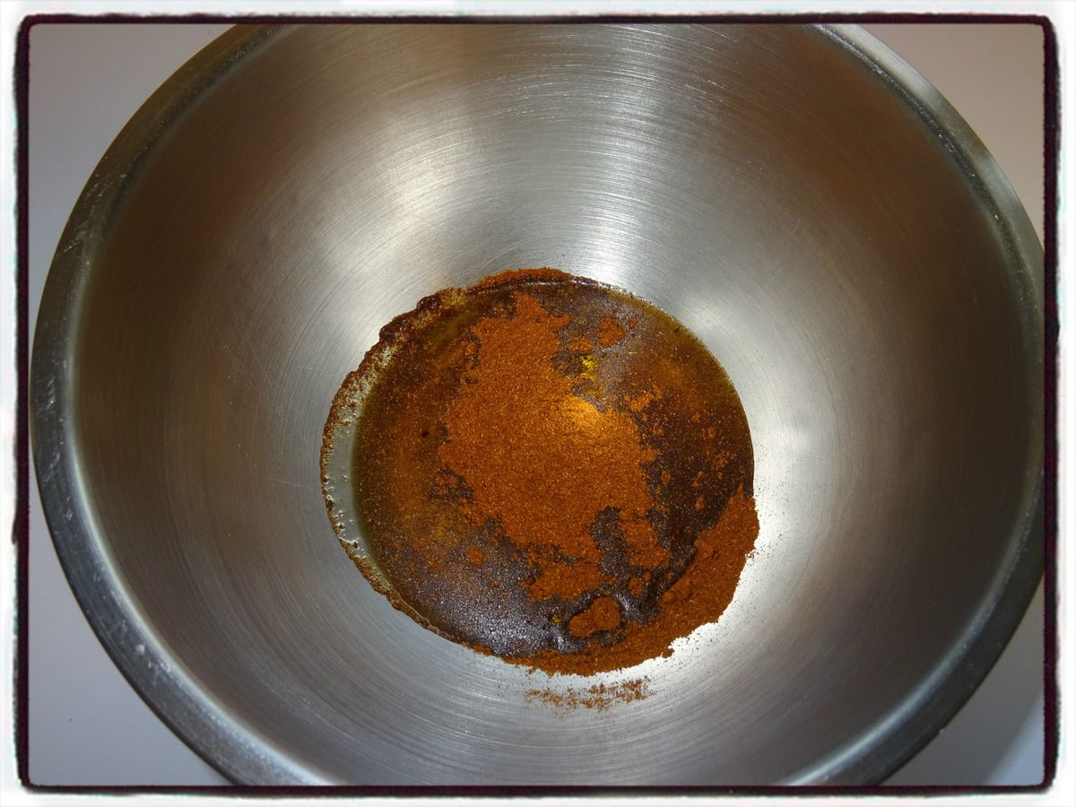 3/ Dans un bol, mélangez l'huile d'olive, le paprika, la fleur de sel et le poivre en grain.