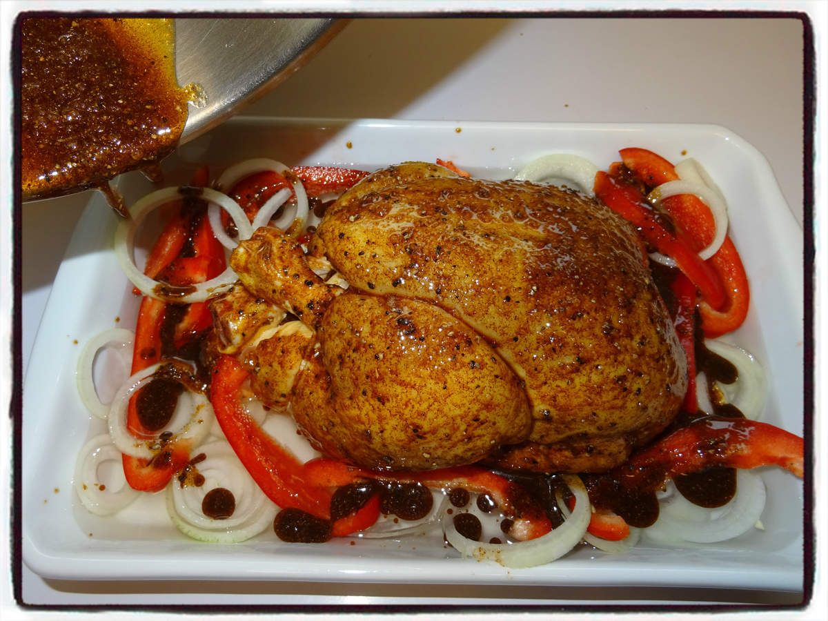 J'ai réalisé une marinade au paprika pour imbiber mon poulet. Et puis, tant qu'à y être, j'ai ajouté des petits oignons et du poivron. Et bien gros succès ici !!! La viande était bien relevée, juteuse et les légumes étaient hypers fondants. C'était tout simplement une tuerie.