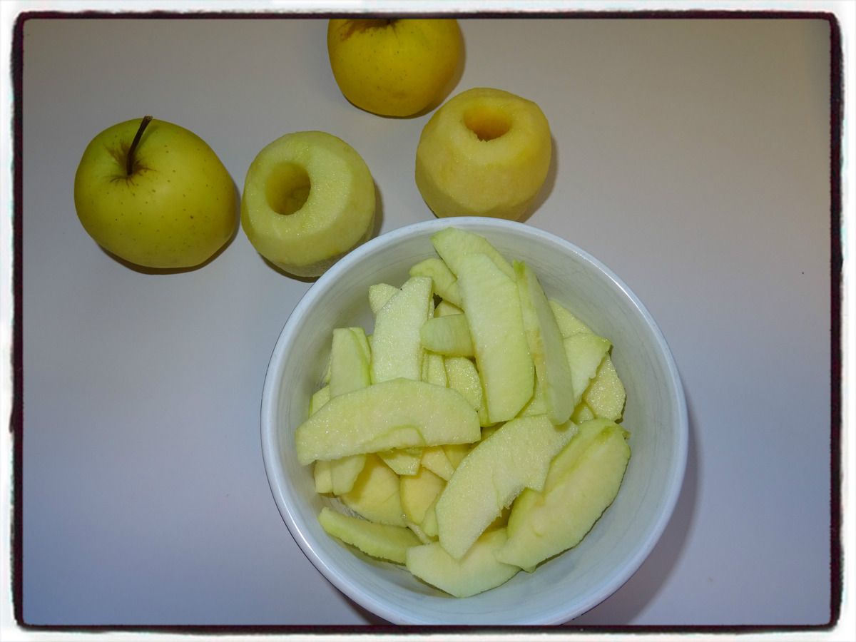 1/ Épluchez et videz les pommes. Coupez les en fines lamelles.