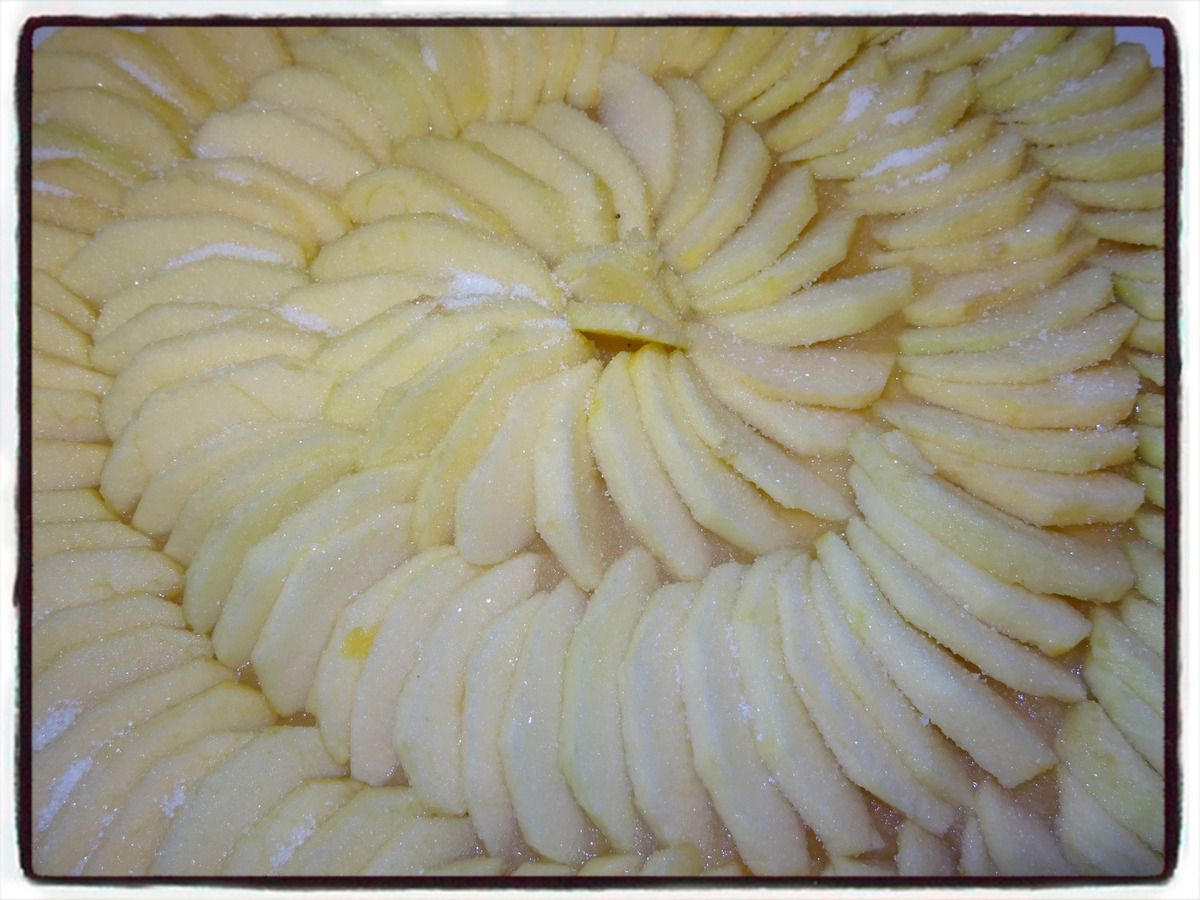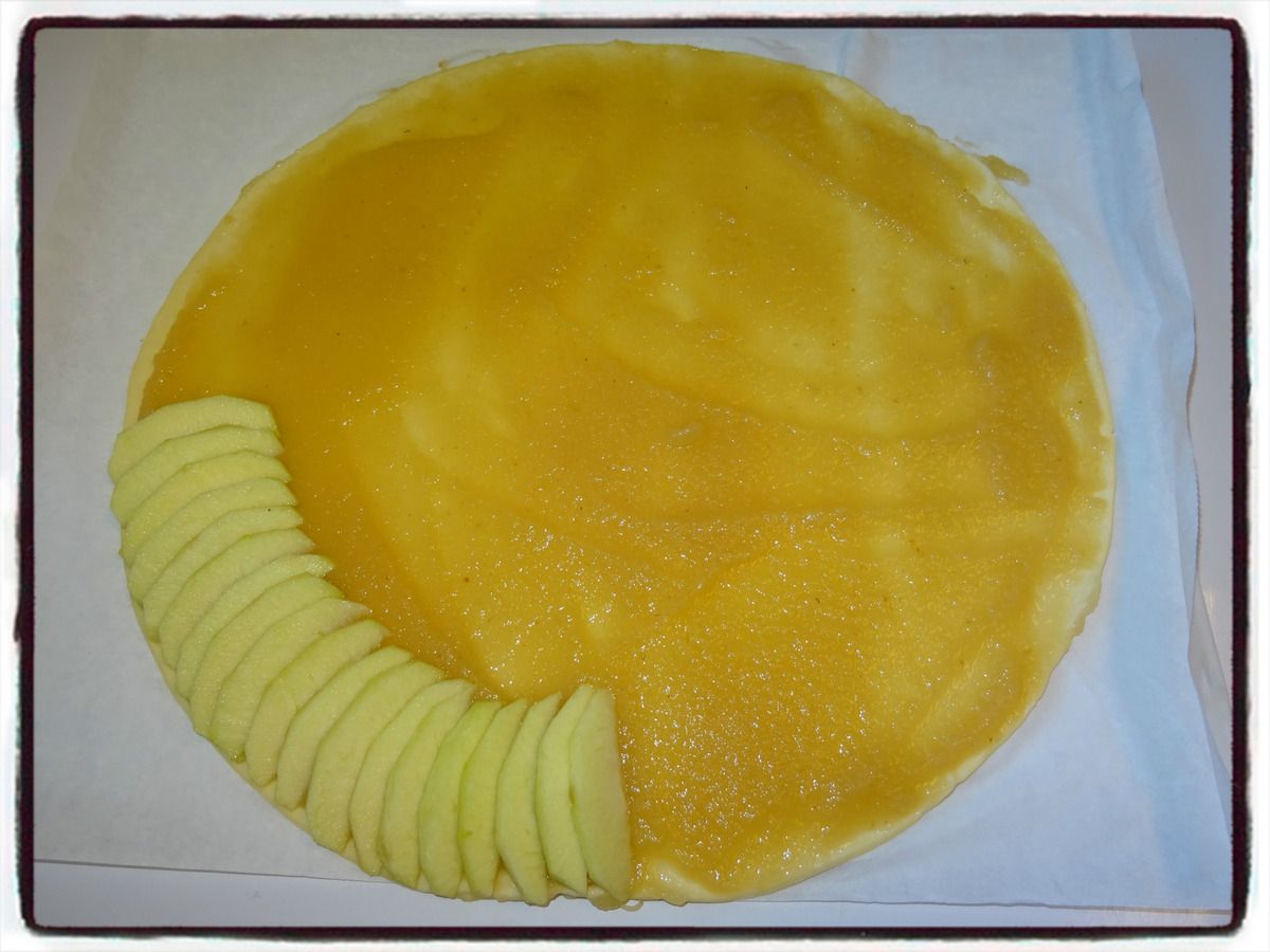 2/ Étalez la compote de pomme sur la pâte brisée, puis disposez les lamelles de pomme par-dessus, en les faisant se chevaucher légèrement.