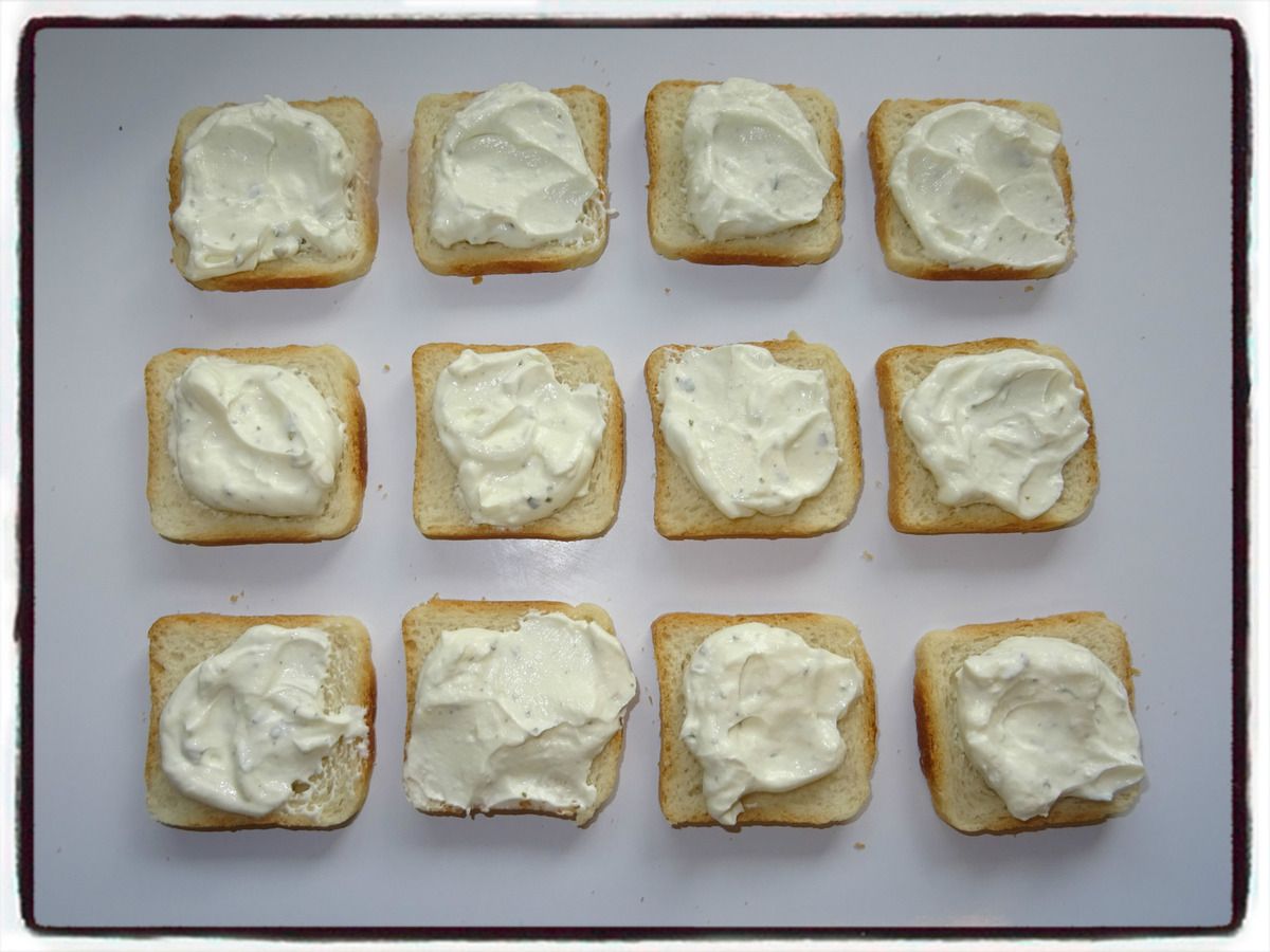 2/ Déposez une cuillère à café de cette préparation sur chaque petits pains à toasts.