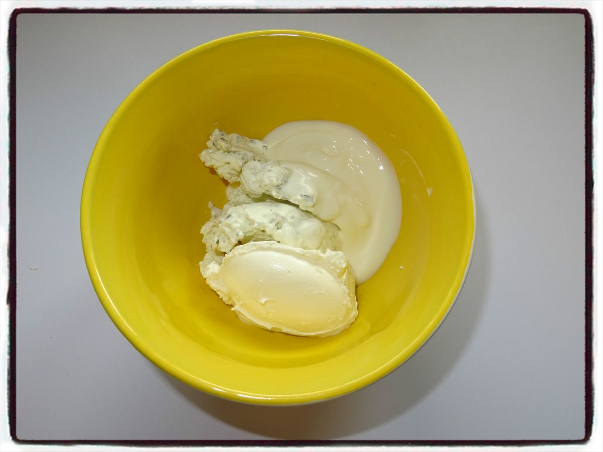 1/ Dans un bol, mélangez le boursin, la crème fraîche et le saint morêt.
