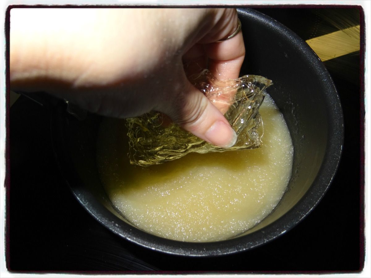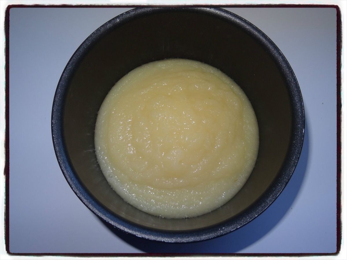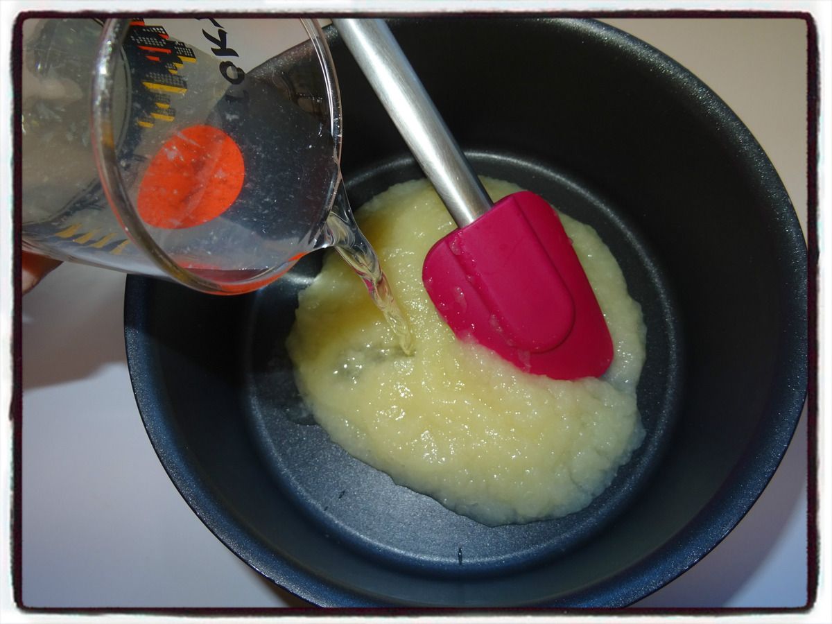 6/ Faites ramollir la gélatine dans de l'eau froide. Une fois la purée de poire bien chaude, faites-y dissoudre la gélatine. Laisse tiédir.