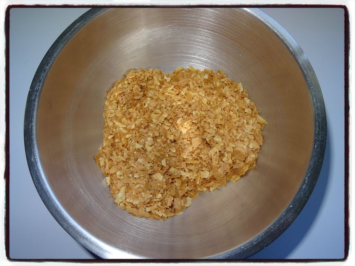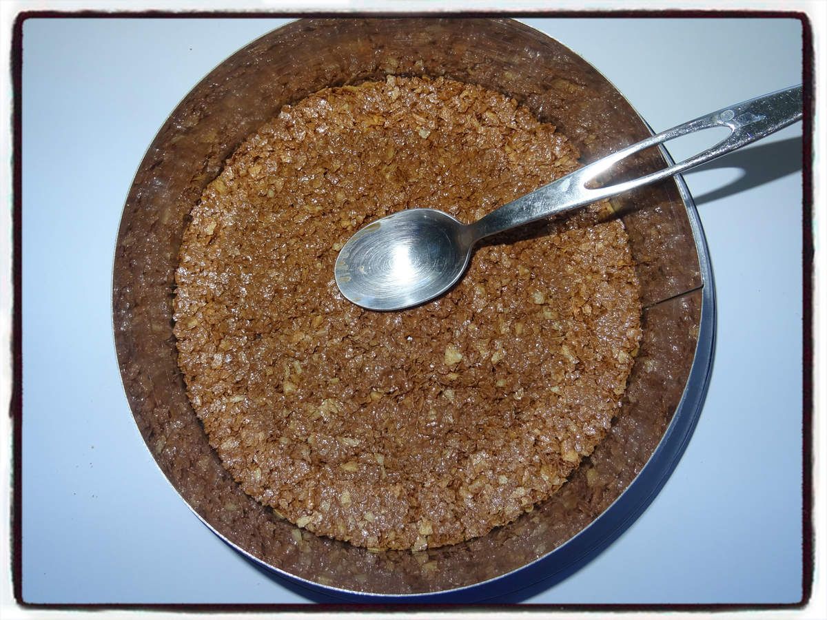 3/ Étalez le croustillant sur un plat de service avec un cercle pâtissier autour. Réservez au frigo.