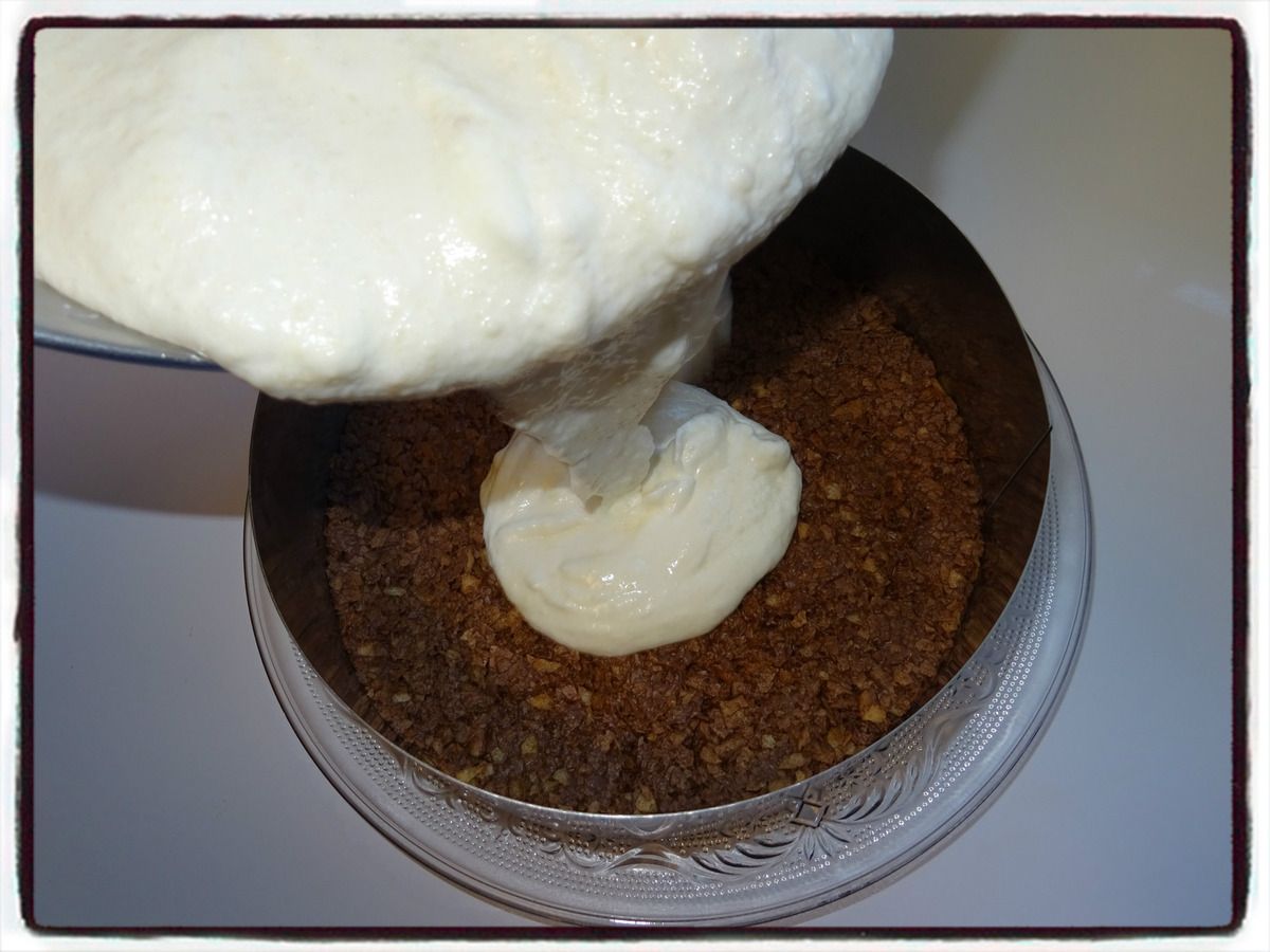 8/ Versez la mousse sur le croustillant praliné et réservez au moins 2 heures au frigo avant de poursuivre.
