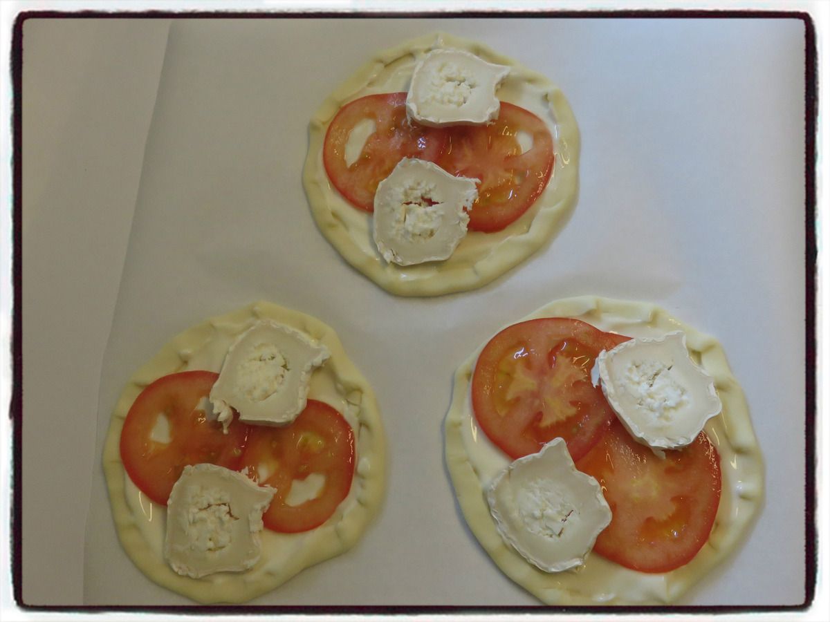 5/ Disposez deux rondelles de tomates puis deux rondelles de chèvre sur chaque feuilleté.