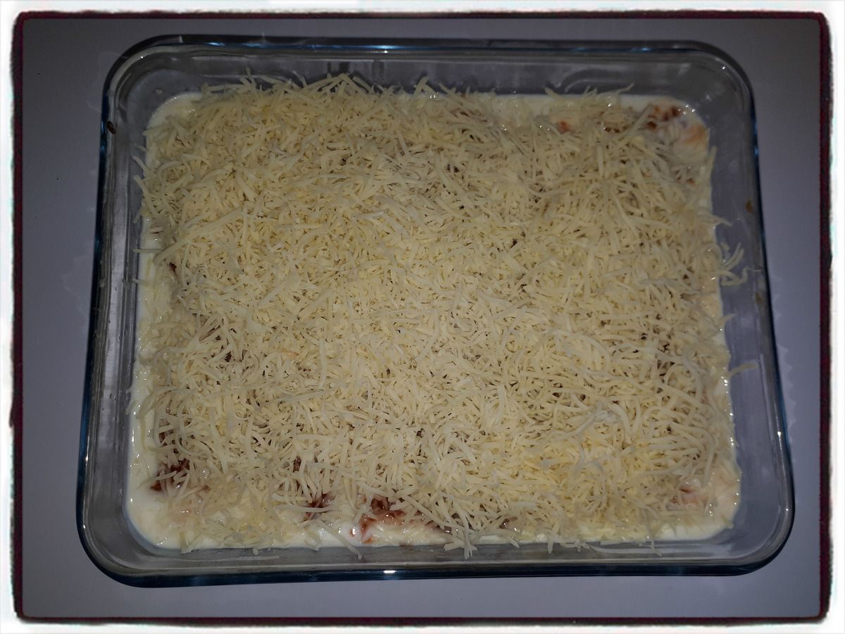 8/ Terminez par une couche de bolognaise puis parsemez du gruyère râpé généreusement.