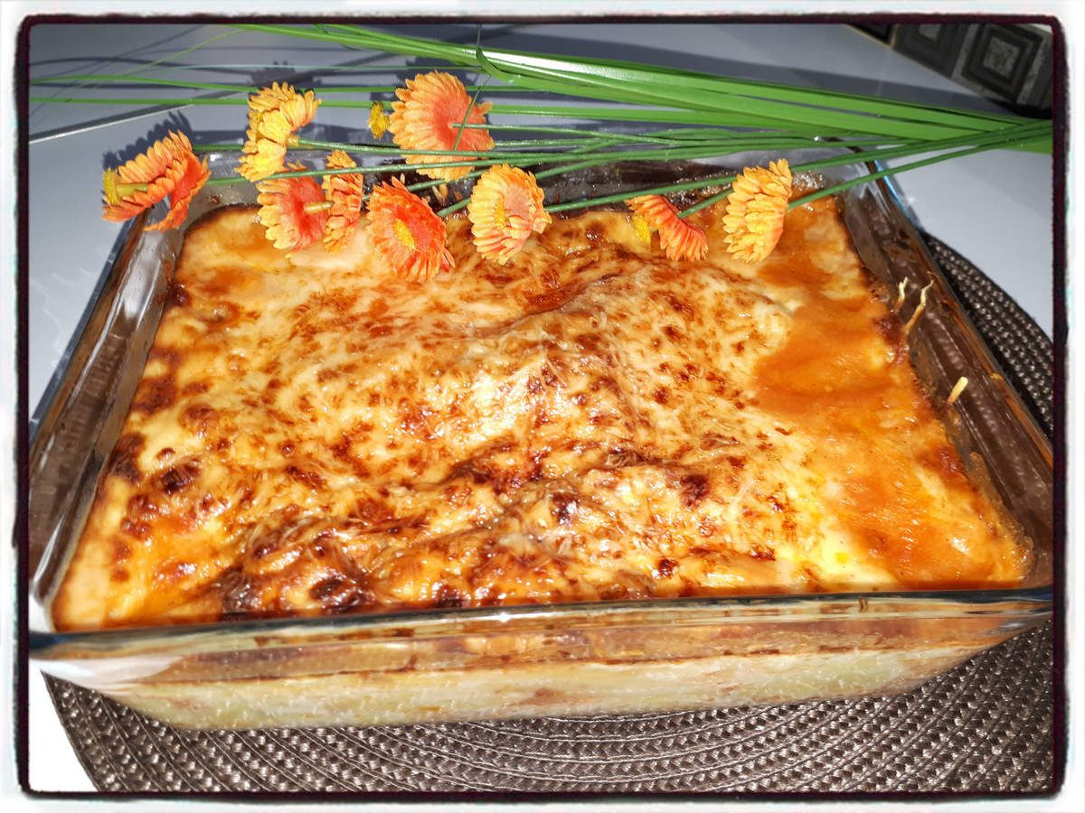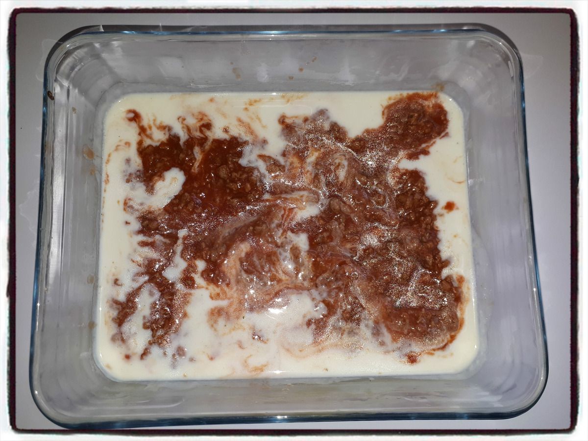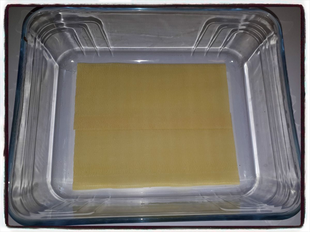 6/ Disposez 2 plaques de lasagne dans le fond d'un plat. Recouvrir avec une couche de béchamel, puis une couche de bolognaise au porc.