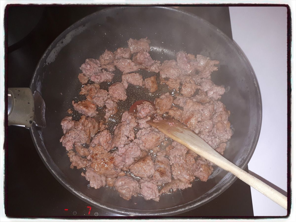 4/ Préparez la bolognaise au porc. Faites revenir la chair à saucisse à la poêle. Mixez-la.