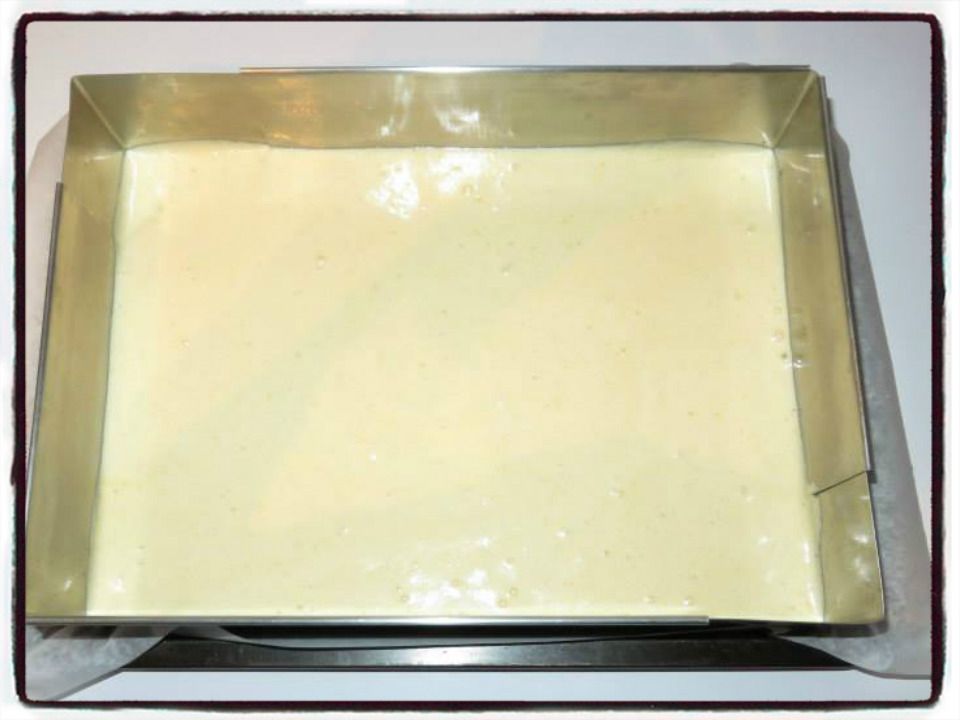 9/ Coupez la génoise à la taille de votre moule à bûche et placez-la dedans. Versez la mousse à la vanille de façon à remplir le moule gouttière jusqu'à la moitié. Réservez 1 heure au frigo pour faire prendre la mousse.