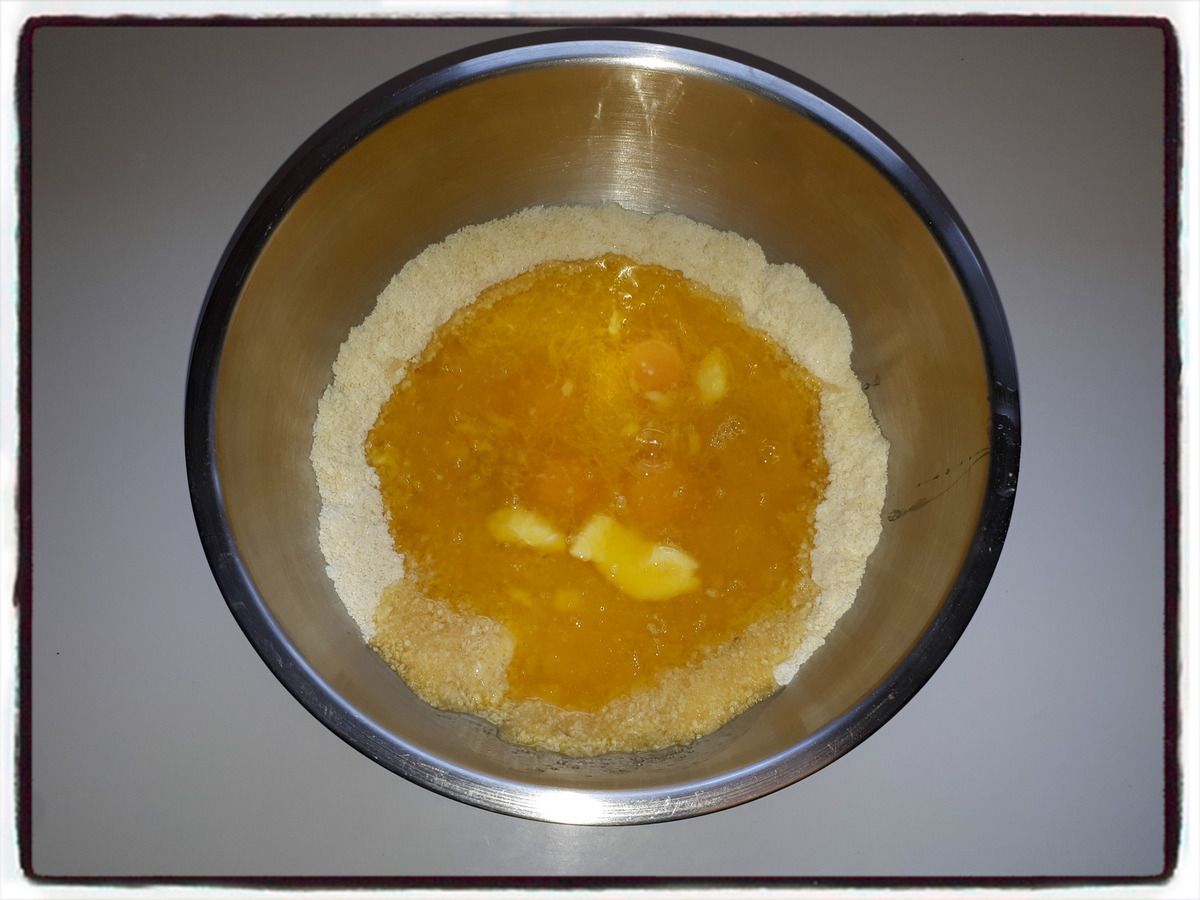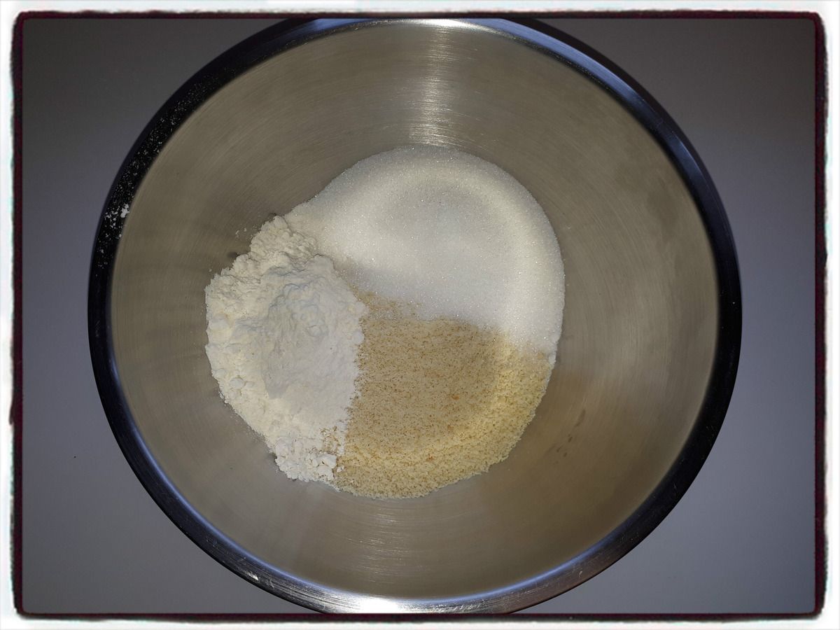 1/ Dans un bol, mélangez ensemble la poudre d'amande, le sucre et la farine.