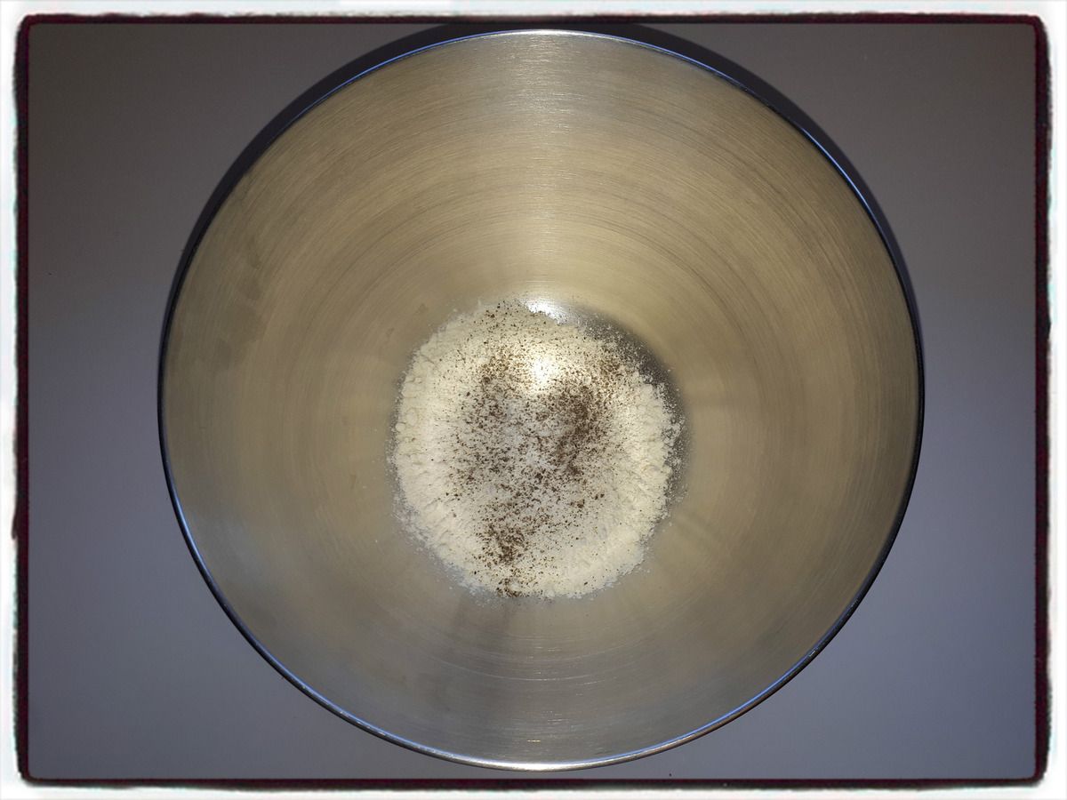 1/ Dans un bol, mélangez ensemble la farine, la levure, le sel et le poivre.