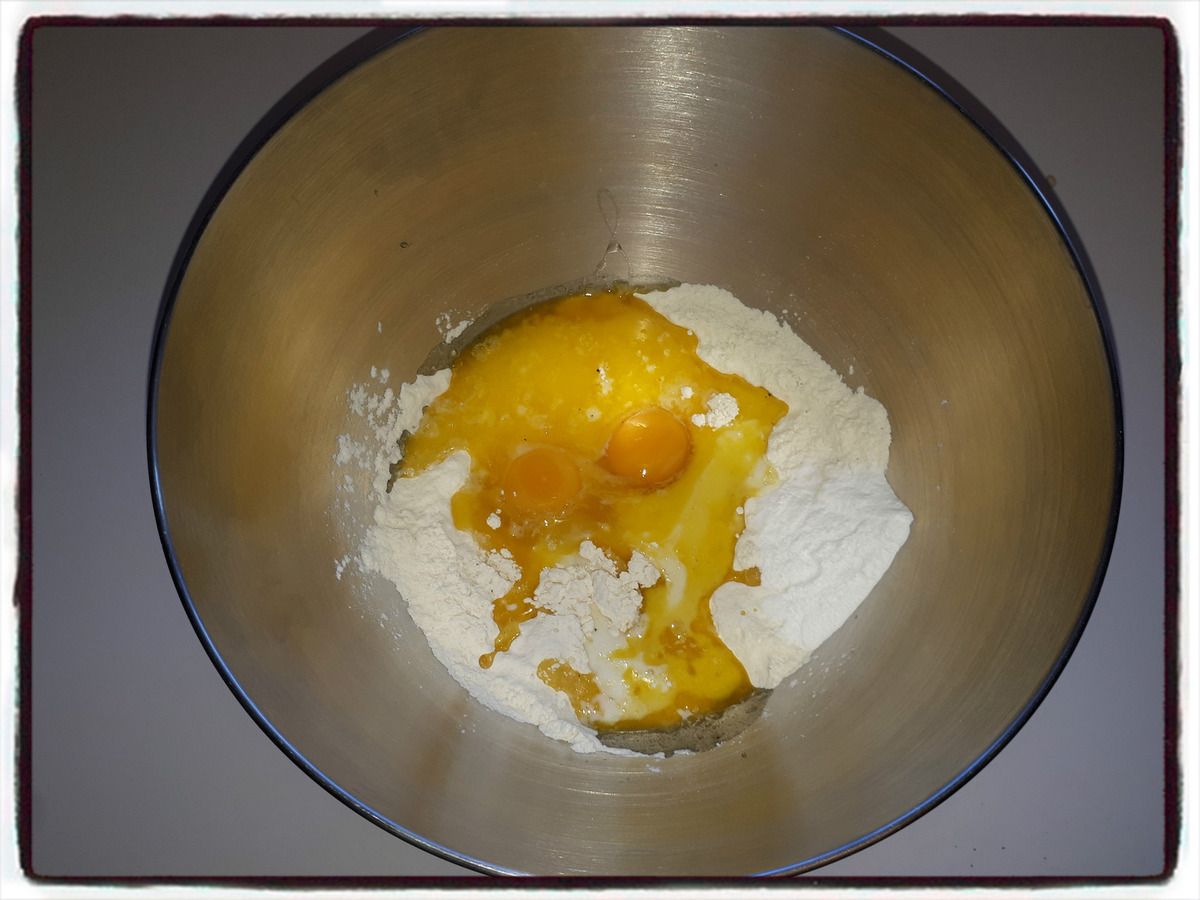 2/ Ajoutez les œufs entiers, le beurre fondu et le lait. Mélangez bien.