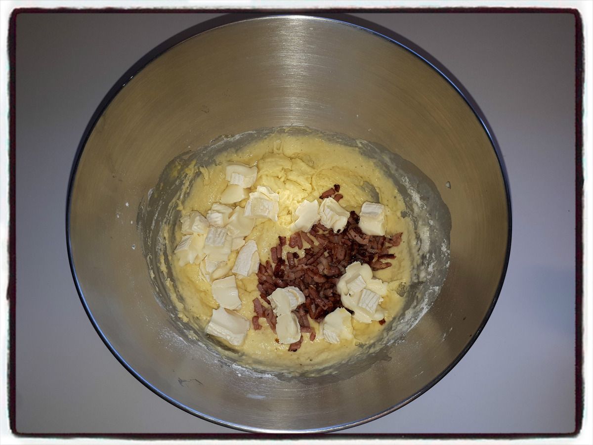 4/ Coupez le reblochon en dés et ajoutez-le à la pâte.