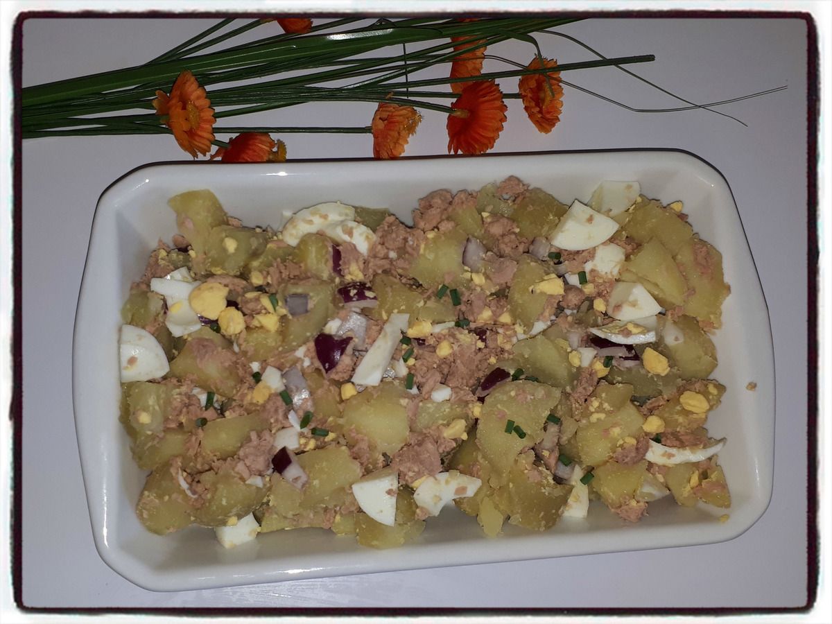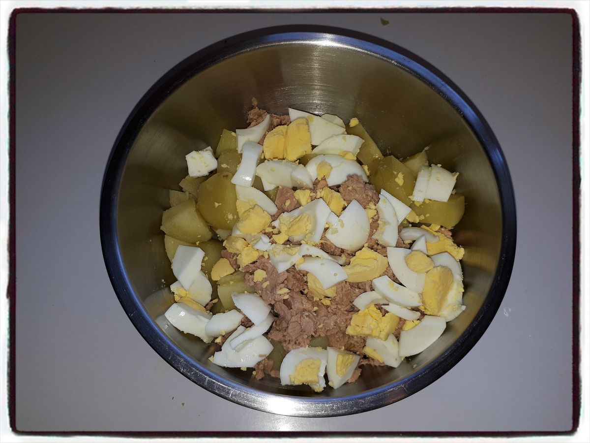 3/ Coupez les pommes de terre en morceaux et mettez les dans un bol. Ajoutez-y le thon égoutté.