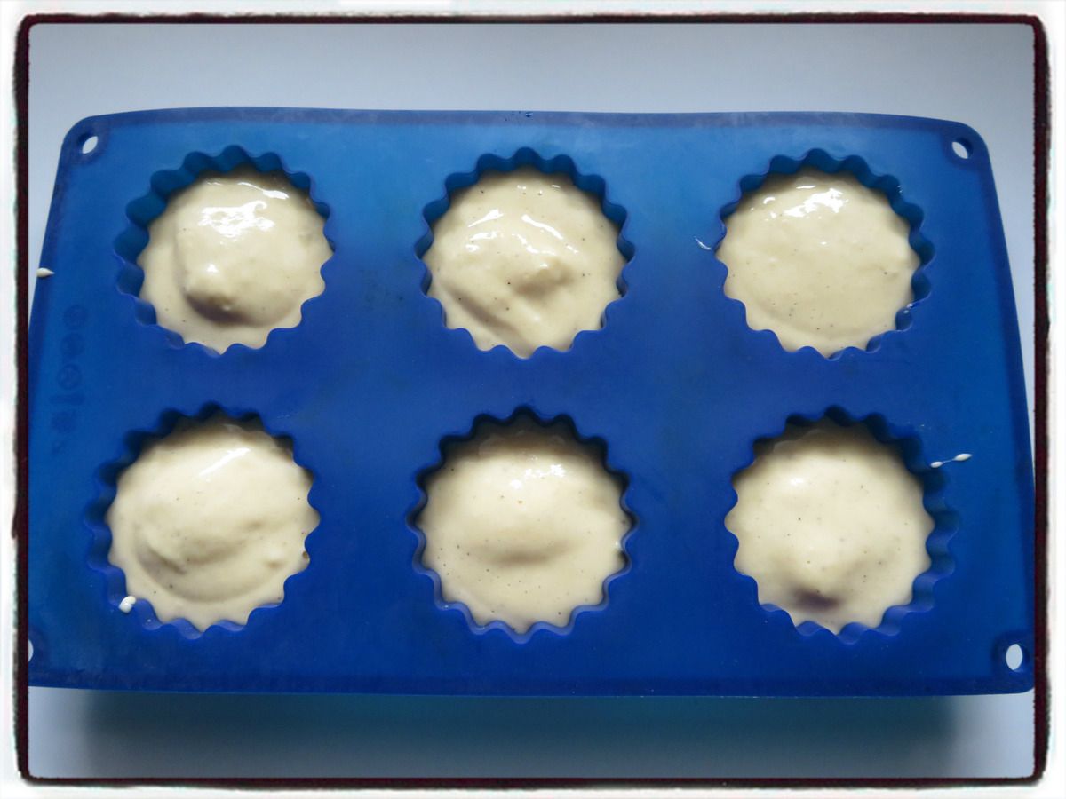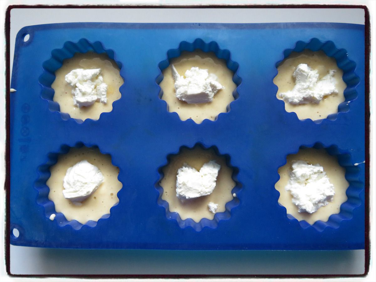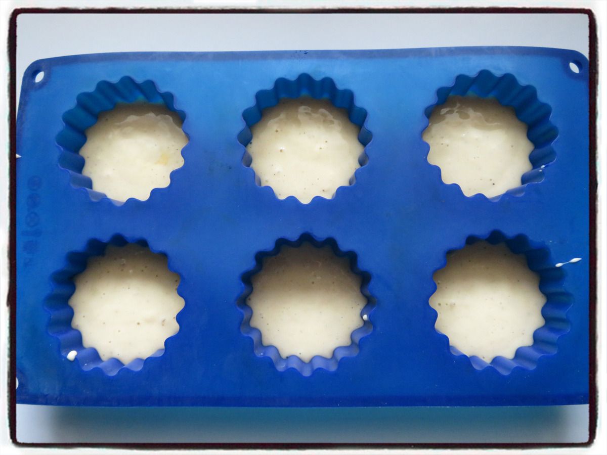 3/ Versez deux bonnes cuillères à soupe de cette préparation dans vos empreintes à muffins.