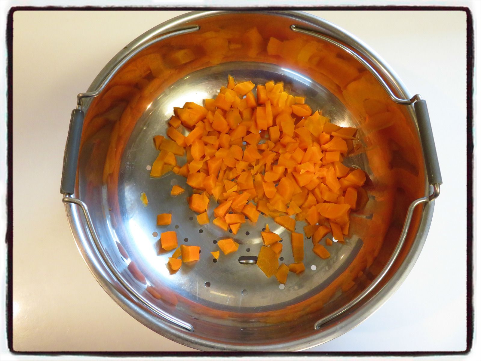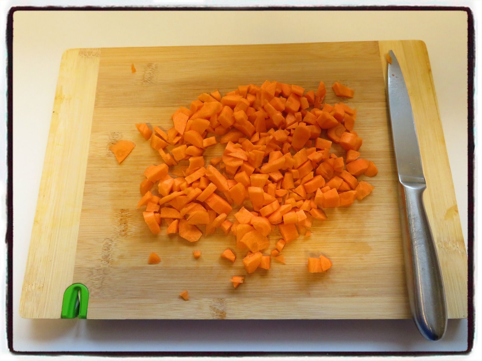 1/ Épluchez et coupez les carottes en petits dés. Faites les précuire 10 minutes dans l'eau bouillante.