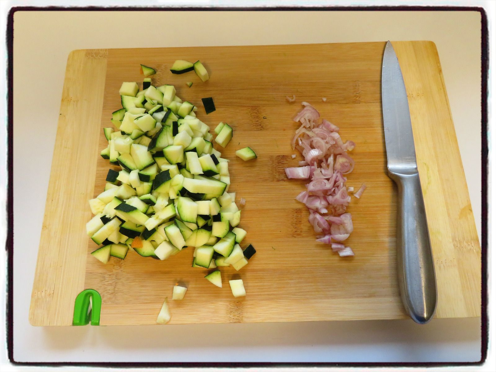2/ Lavez soigneusement la courgette et épluchez la une rangée sur deux. Coupez la en petits dés ainsi que l'échalote.