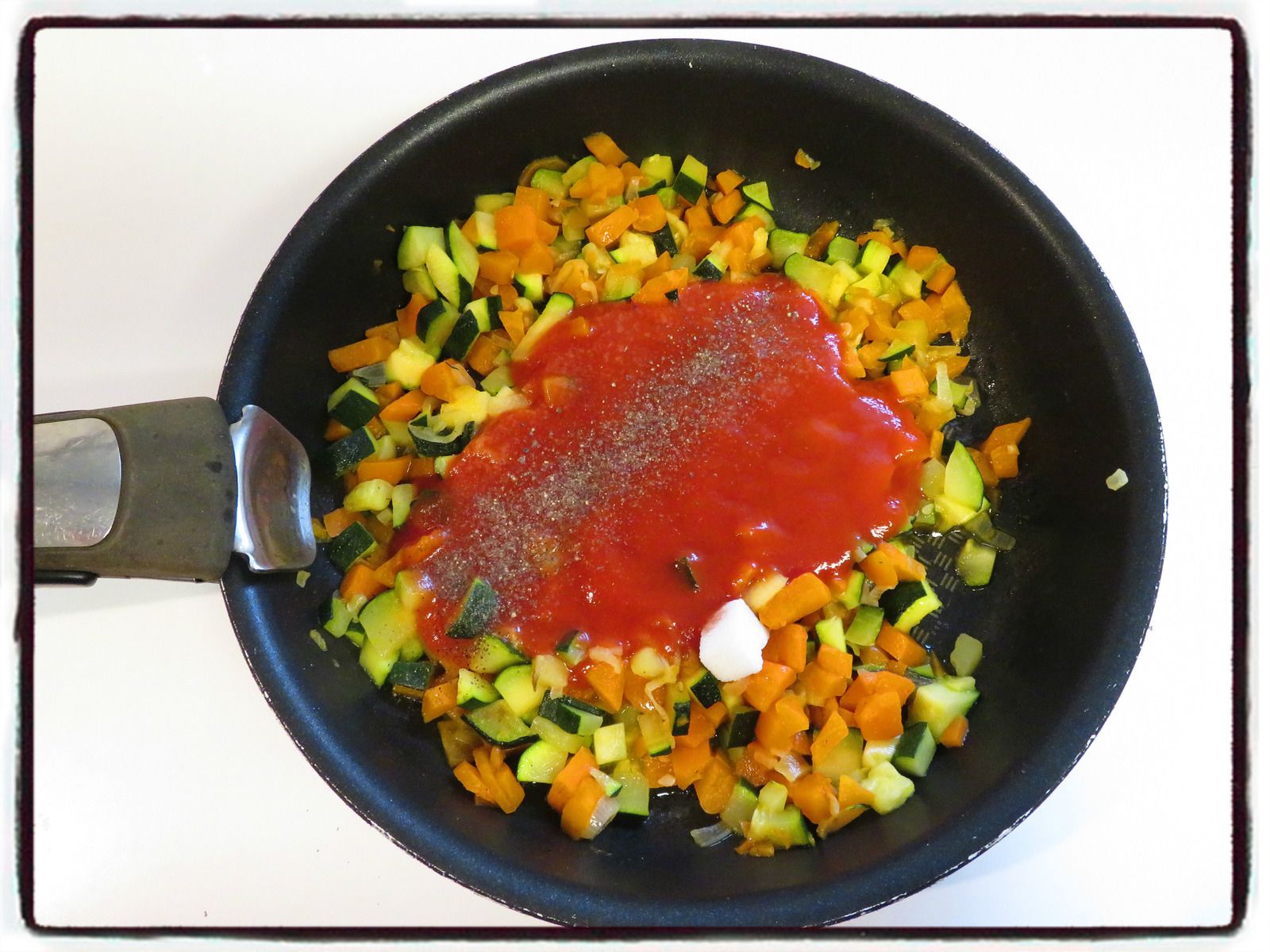 5/ Ajoutez la purée de tomate, le demi sucre, du sel et du poivre. Mélangez bien.