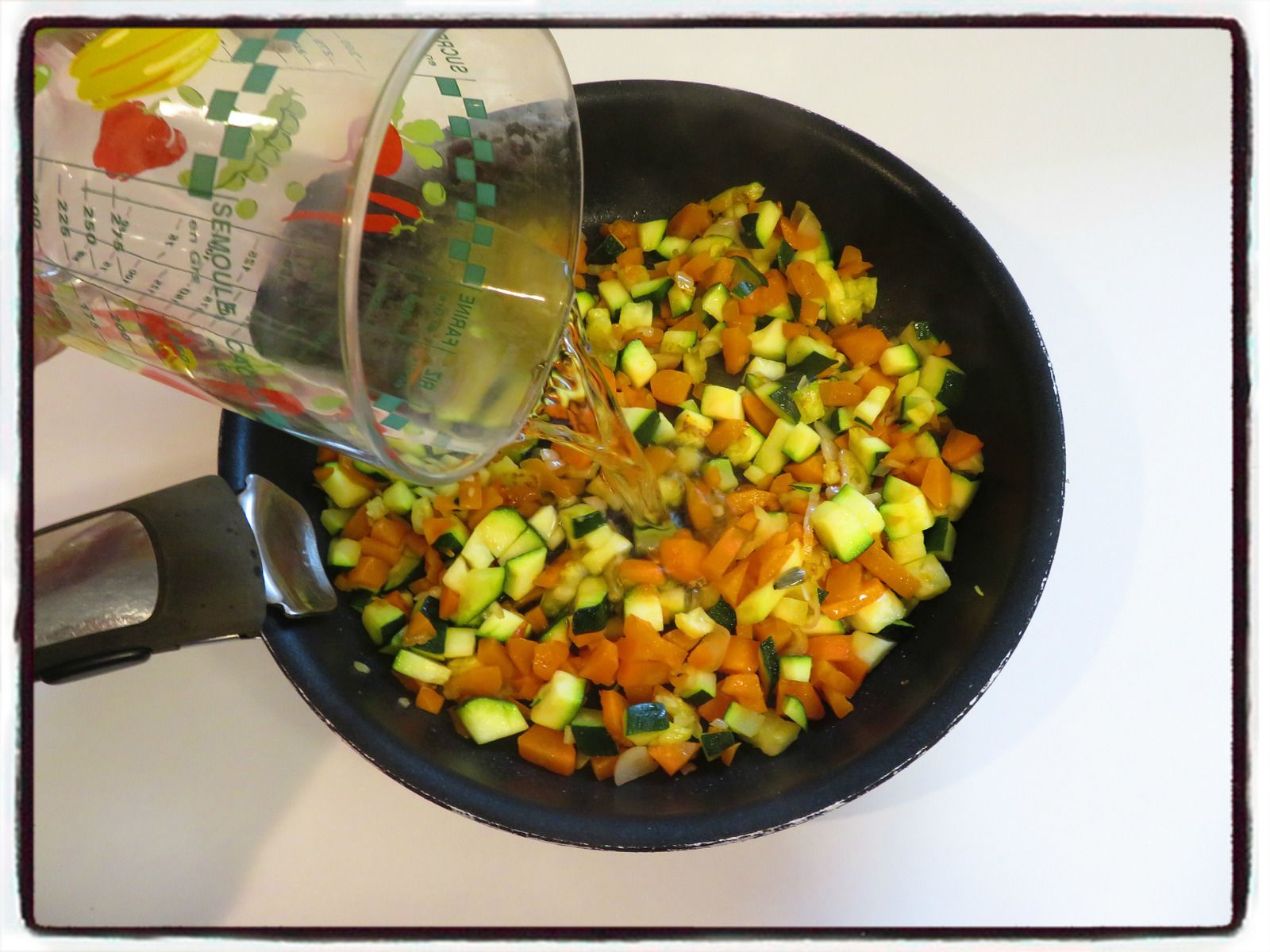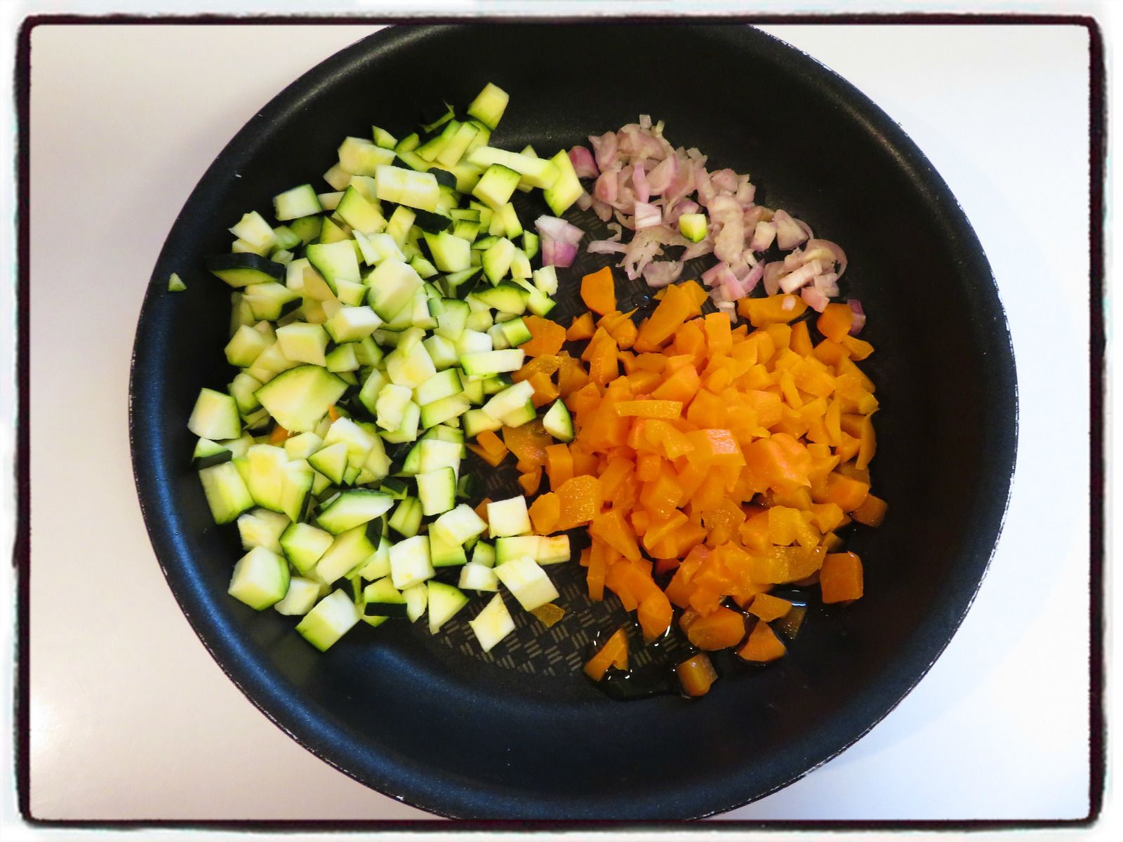 3/ Faites revenir les dés de carottes, la courgette et l'échalote à la poêle avec l'huile d'olive quelques minutes.