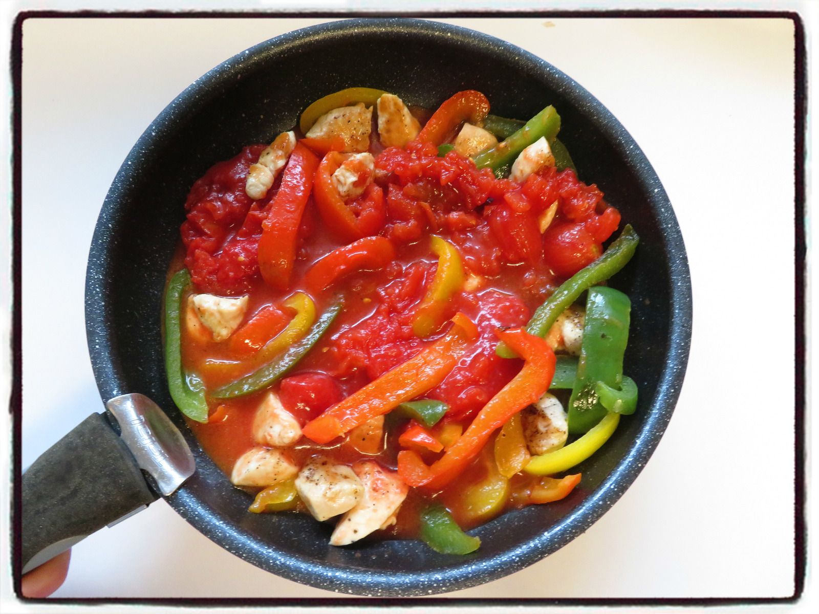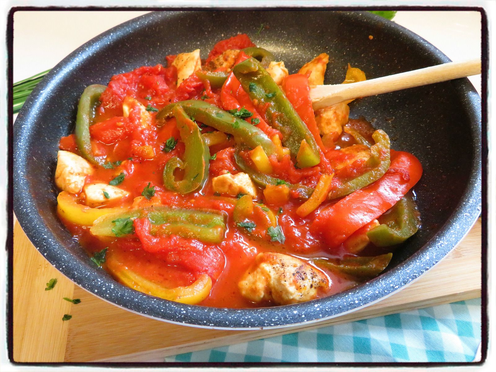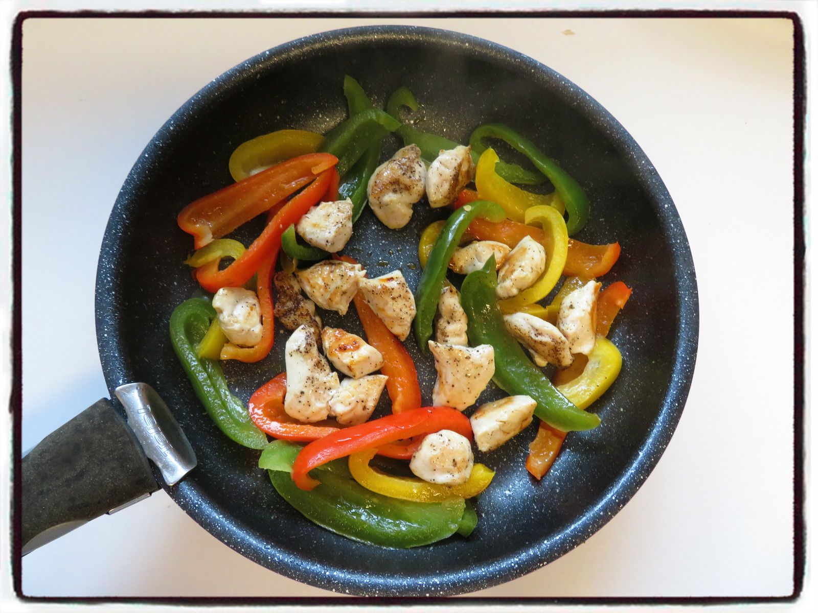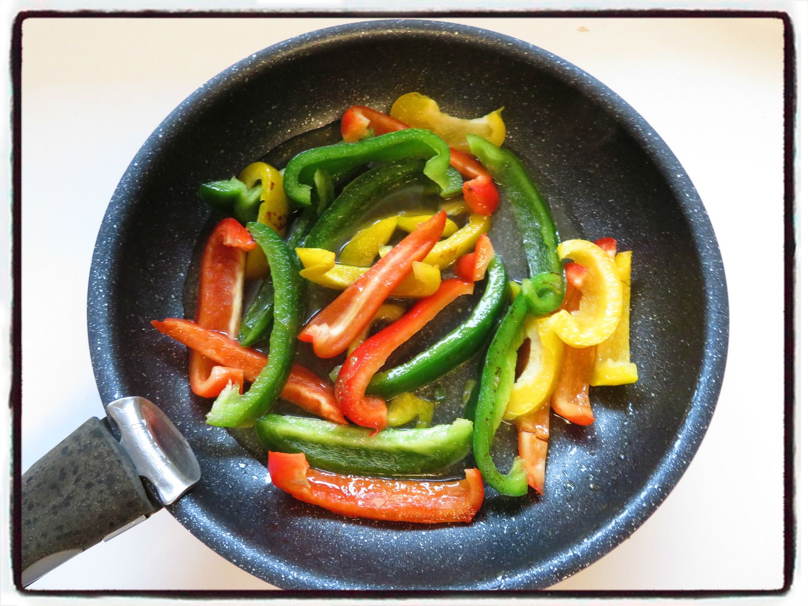 3/ Dans la même poêle, faites revenir les lamelles de poivrons quelques minutes.