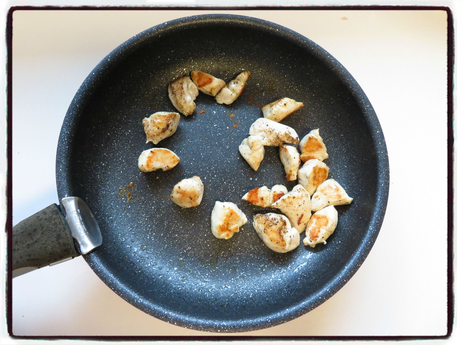 2/ Coupez les aiguillettes de poulet en dés et faites les revenir à la poêle avec l'huile d'olive. Salez et poivrez. Réservez.