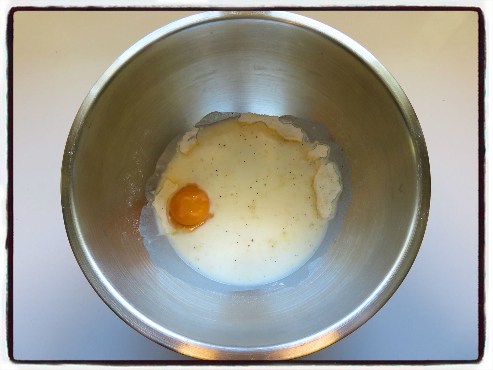 3/ Ajoutez le jaune d’œuf et le lait à la farine. Mélangez à l'aide du fouet.