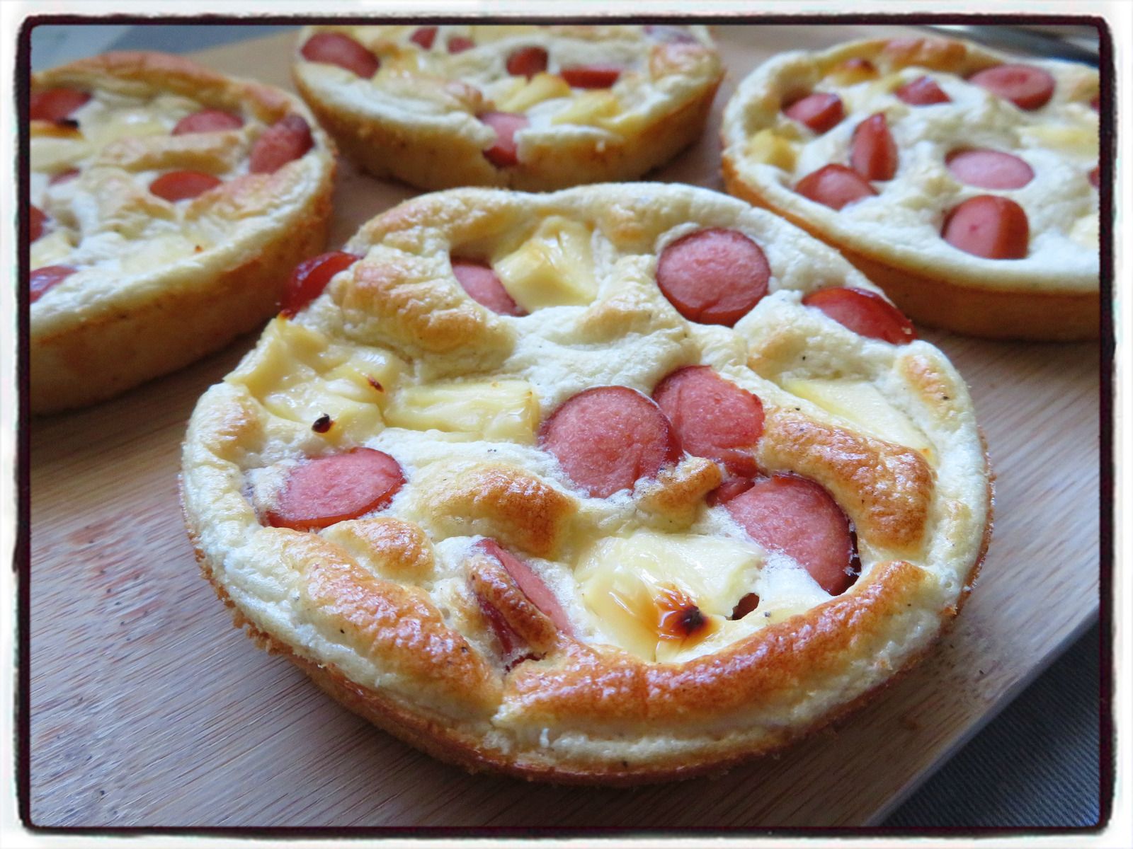 6/ Coupez les knackis en rondelles fines et les portions de vache qui rit en petits morceaux. Disposez en quelques morceaux de chaque sur la pâte.
