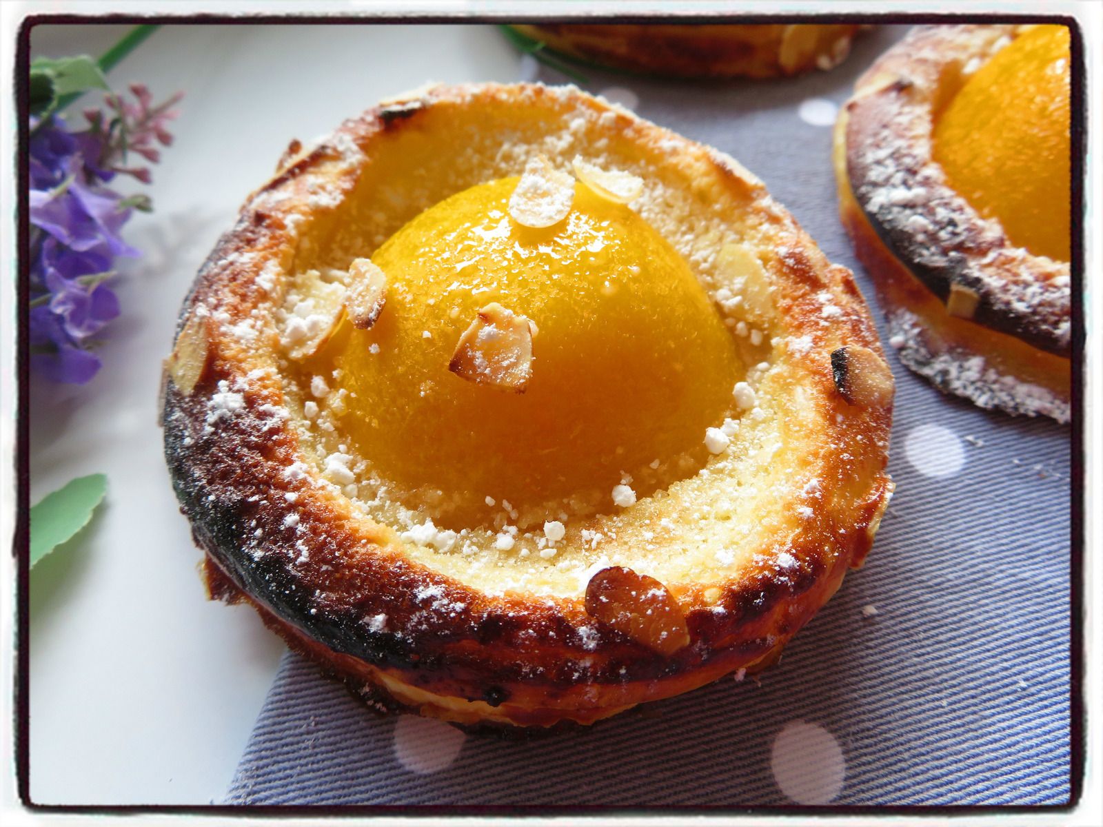 5/ Égouttez les demis pêches au sirop et placez les sur la préparation aux amandes.