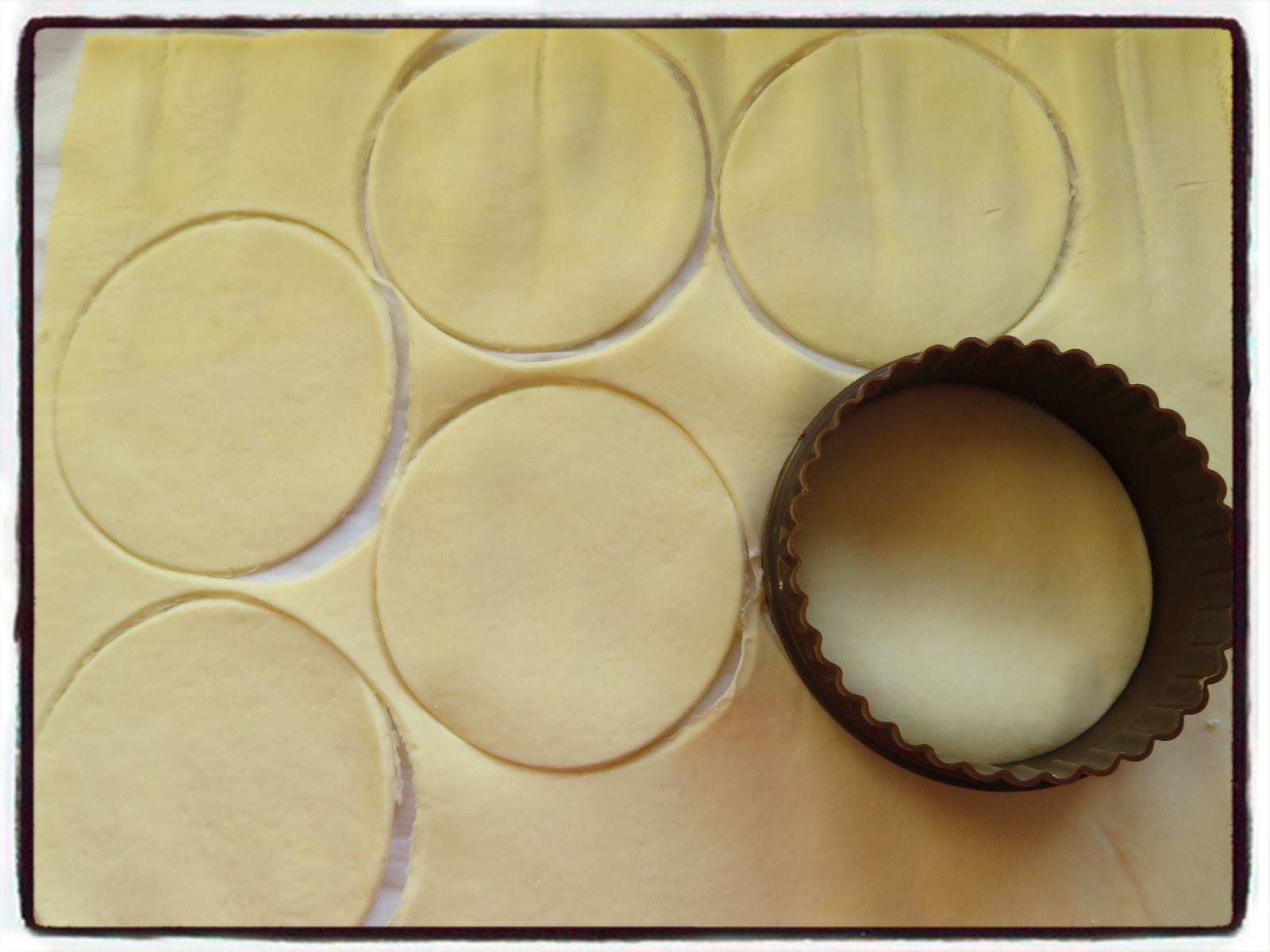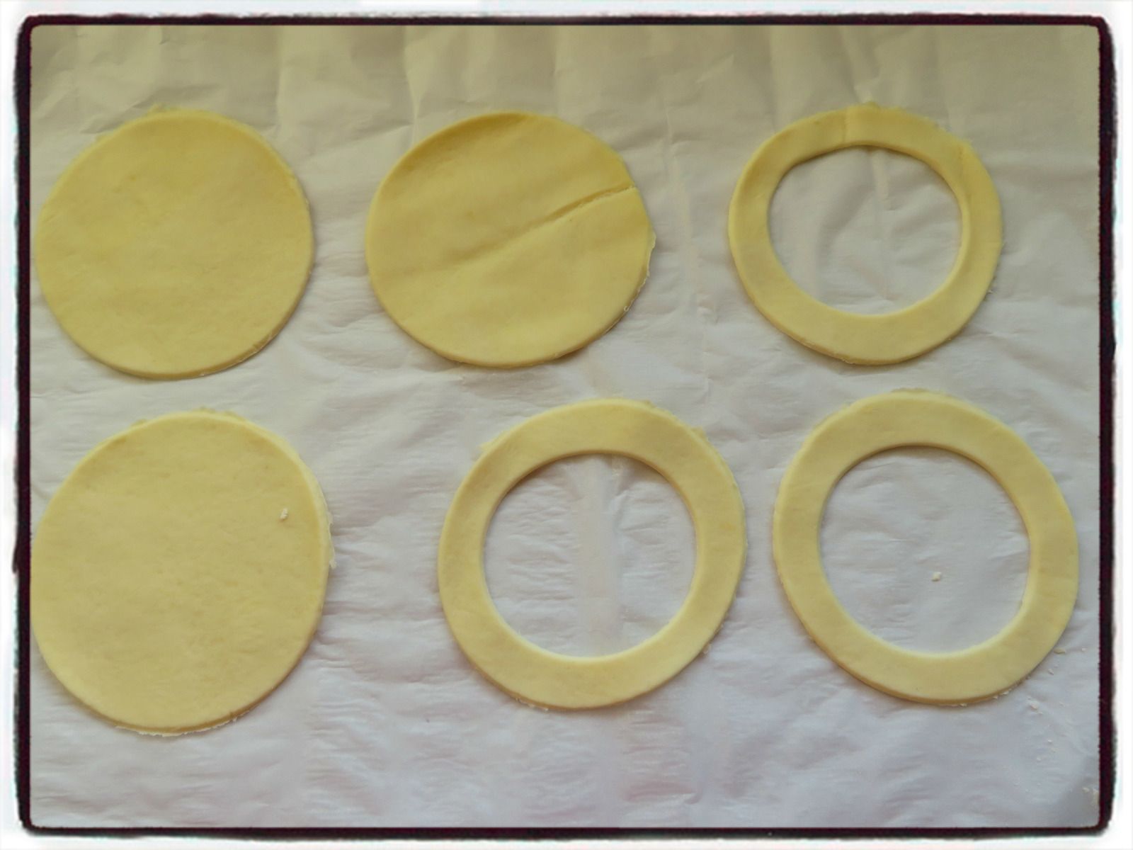 1/ Découpez 6 ronds dans la pâte feuilletée. Retirez le centre de 3 d'entres eux.