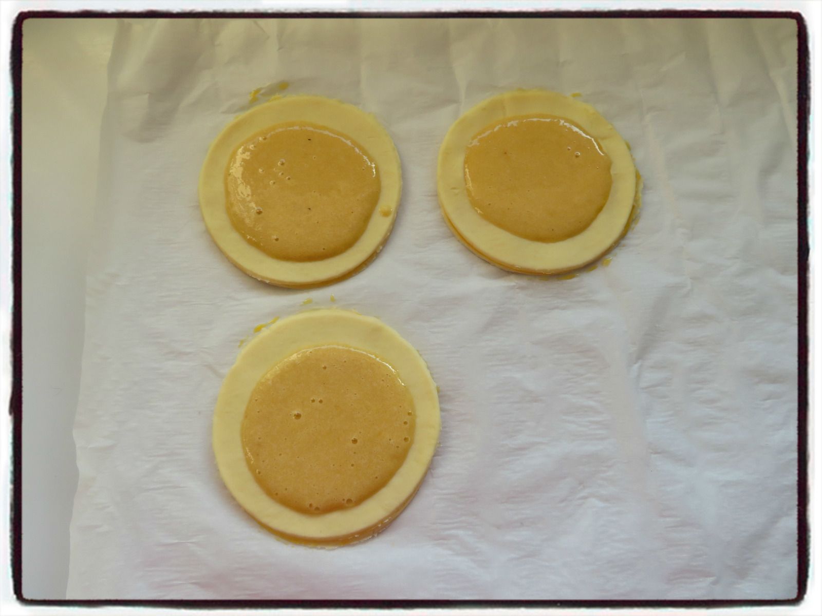 2/ Badigeonnez les bords des ronds pleins de jaune d’œuf, puis disposez un rond vide sur chacun.